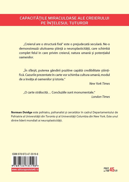 Norman Doidge este psihiatru, psihanalist şi cercetător în cadrul Departamentului de Psihiatrie al Universităţii din Toronto și al Universității Columbia din New York. Este unul dintre liderii mondiali ai neuroplasticității.