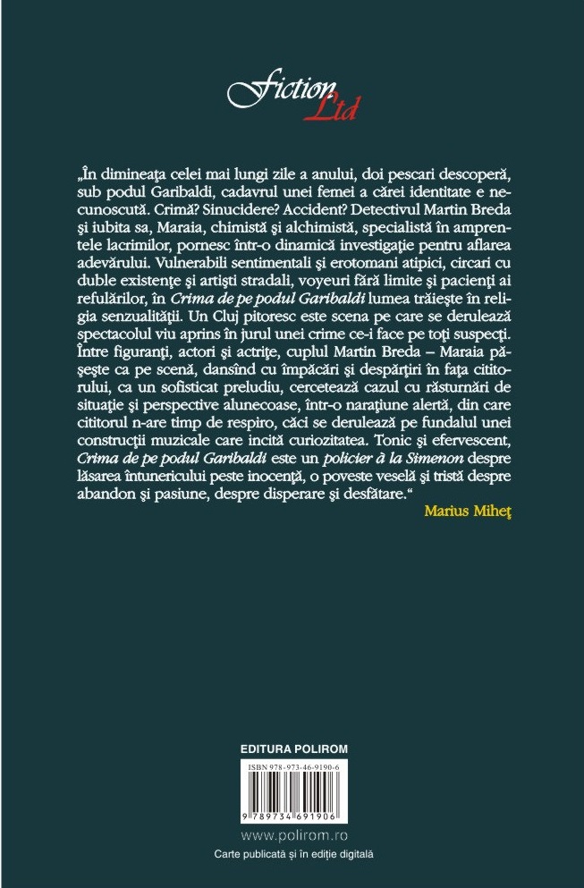 „În dimineața celei mai lungi zile a anului, doi pescari descoperă, sub podul Garibaldi, cadavrul unei femei a cărei identitate e necunoscută. Crimă? Sinucidere? Accident? Detectivul Martin Breda și iubita sa, Maraia, chimistă și alchimistă, specialistă în amprentele lacrimilor, pornesc într-o dinamică investigație pentru aflarea adevărului. Vulnerabili sentimentali și erotomani atipici, circari cu duble existențe și artiști stradali, voyeuri fără limite și pacienți ai refulărilor, în Crima de pe podul Garibaldi lumea trăiește în religia senzualității. Un Cluj pitoresc este scena pe care se derulează spectacolul viu aprins în jurul unei crime ce-i face pe toți suspecți. Între figuranți, actori și actrițe, cuplul Martin Breda – Maraia pășește ca pe scenă, dansând cu împăcări și despărțiri în fața cititorului, ca un sofisticat preludiu, cercetează cazul cu răsturnări de situație și perspective alunecoase, într-o narațiune alertă, din care cititorul n-are timp de respiro, căci se derulează pe fundalul unei construcții muzicale care incită curiozitatea. Tonic și efervescent, Crima de pe podul Garibaldi este un policier à la Simenon despre lăsarea întunericului peste inocență, o poveste veselă și tristă despre abandon și pasiune, despre disperare și desfătare.” (Marius Miheț)