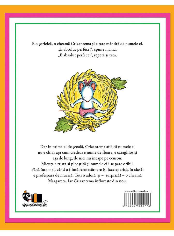 Dar în prima zi de școală, Crizantema află că numele ei nu e chiar așa cum credea: e nume de floare, e caraghios și așa de lung, de nici nu încape pe ecuson.