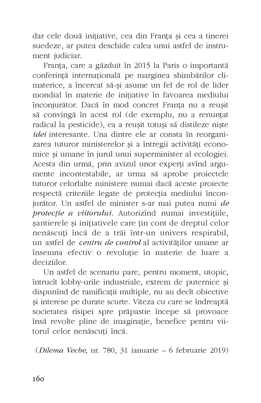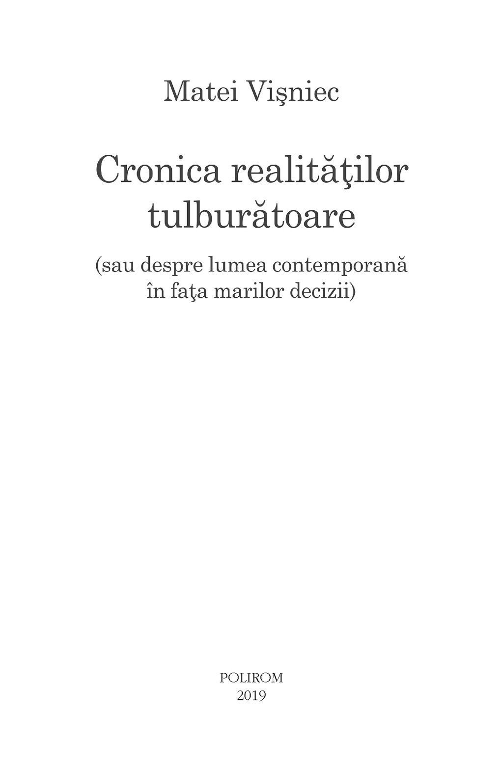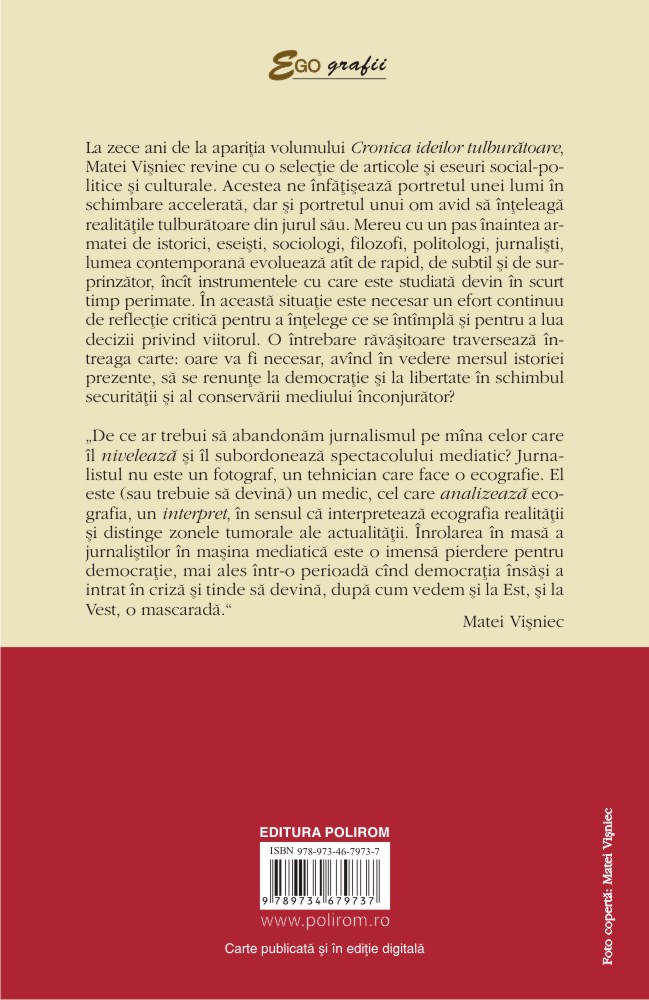 La zece ani de la apariția volumului Cronica ideilor tulburătoare, Matei Vișniec revine cu o selecție de articole și eseuri social-politice și culturale. Acestea ne înfățișează portretul unei lumi în schimbare accelerată, dar și portretul unui om avid să înțeleagă realitățile tulburătoare din jurul său. Mereu cu un pas înaintea armatei de istorici, eseiști, sociologi, filozofi, politologi, jurnaliști, lumea contemporană evoluează atît de rapid, de subtil și de surprinzător, încît instrumentele cu care este studiată devin în scurt timp perimate. În această situație este necesar un efort continuu de reflecție critică pentru a înțelege ce se întîmplă și pentru a lua decizii privind viitorul. O întrebare răvășitoare traversează întreaga carte: oare va fi necesar, avînd în vedere mersul istoriei prezente, să se renunțe la democrație și la libertate în schimbul securității și al conservării mediului înconjurător?