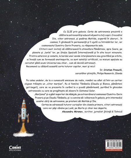 Cu ILIE prin galaxie. Carte de astronomie se dorește a fi un ghid pentru copii în care vor descoperi diverse informații despre Pământ și Soare, despre sateliți naturali și artificiali, despre constelații și comete, despre rachete și stații spațiale, despre cum putem ajunge pe alte planete și ce vom găsi acolo.