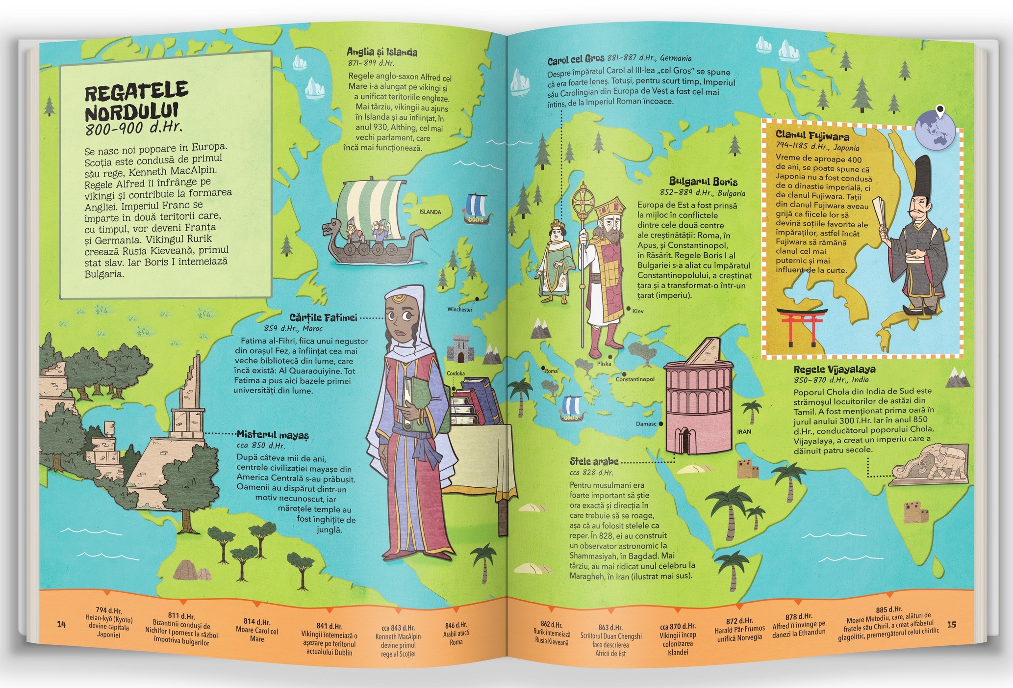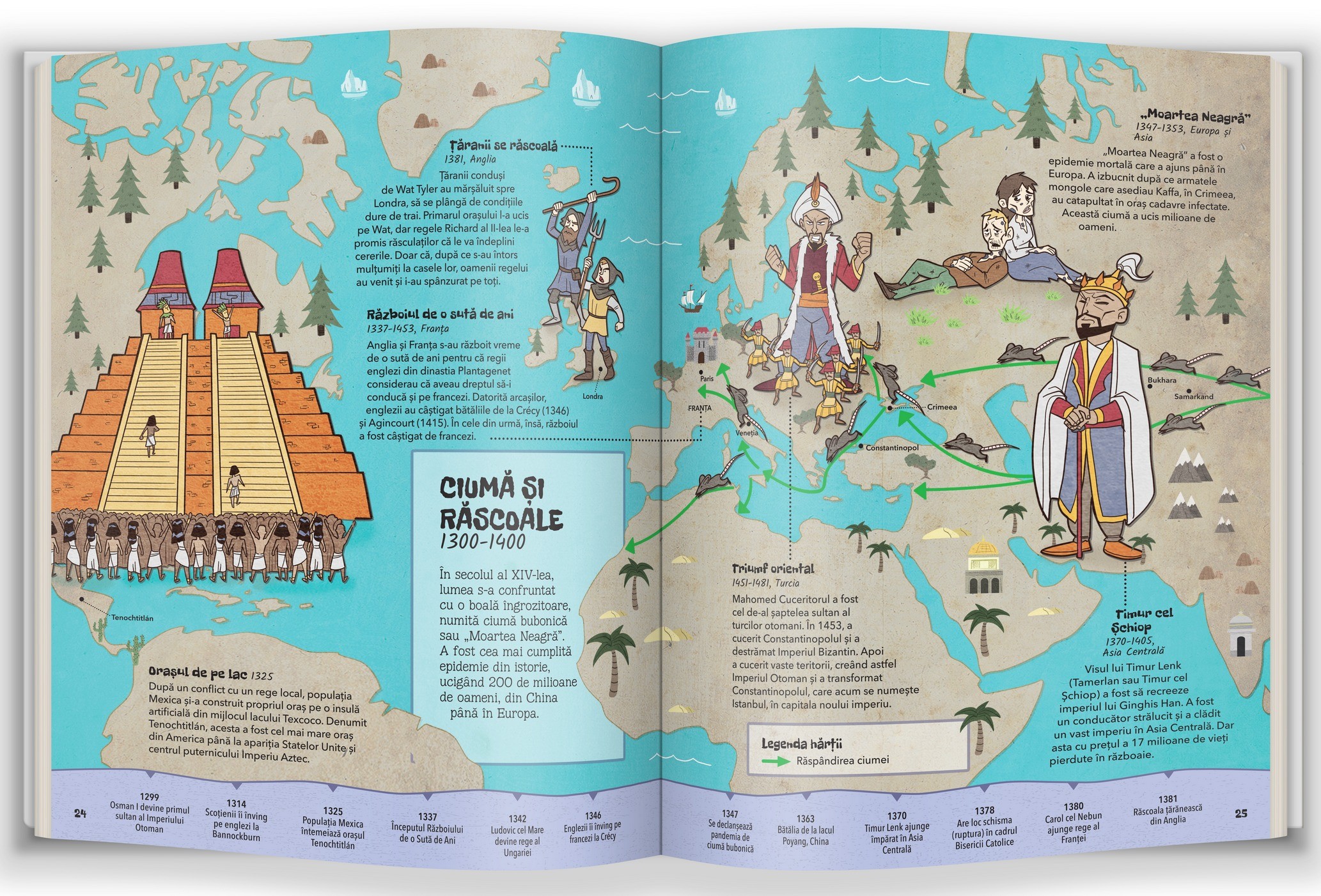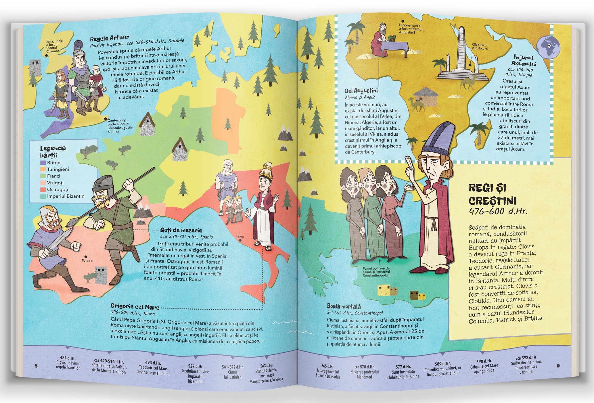 Faptele istorice sunt prezentate cronologic, pe hărți ilustrate, astfel încât copiii să înțeleagă ce se întâmpla în lume în aceeași perioadă de timp.