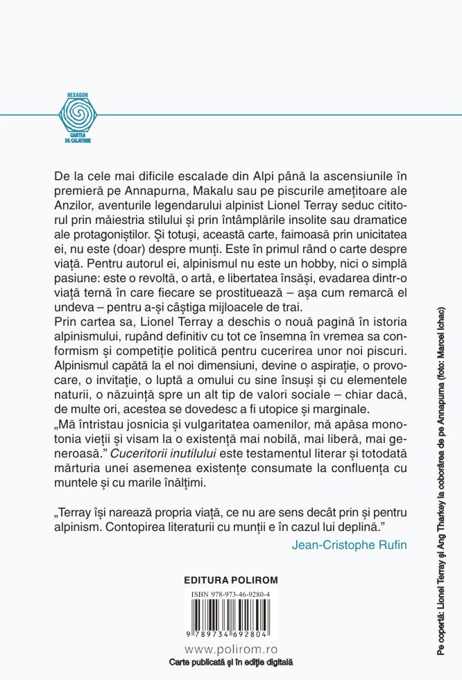 „Mă întristau josnicia și vulgaritatea oamenilor, mă apăsa monotonia vieții și visam la o existență mai nobilă, mai liberă, mai generoasă.” Cuceritorii inutilului este testamentul literar și totodată mărturia unei asemenea existențe consumate la confluența cu muntele și cu marile înălțimi.