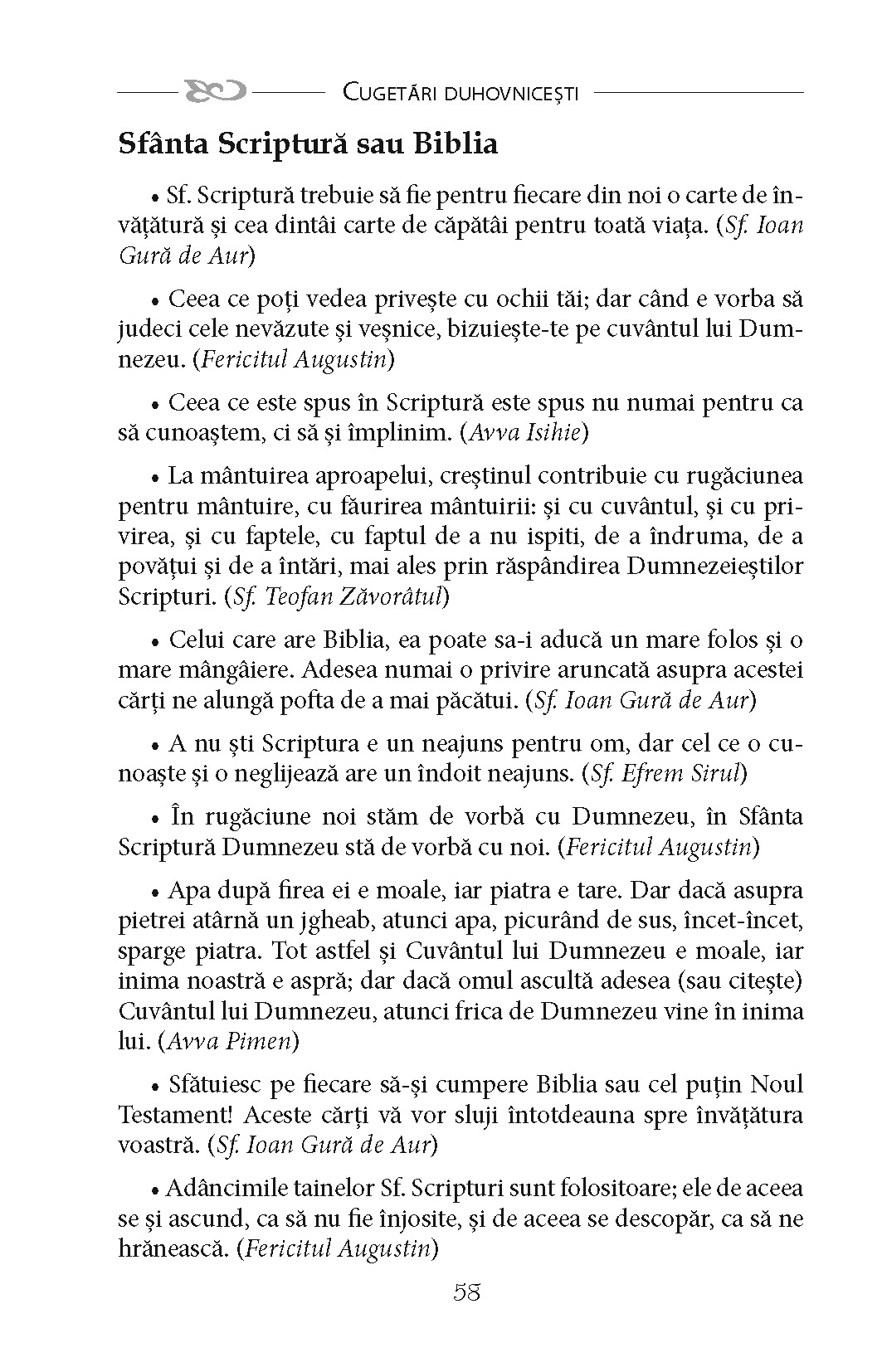 Prezenta antologie este alcătuită din 2 compartimente structurate tematic de cugetări duhovniceşti ale sfinţilor care au trăit în epoci şi în ţări diferite – simpli monahi, ierarhi ai Bisericii, scriitori bisericeşti sau preoţi de mir. Partea a doua a cărţii conţine un indice biografic al autorilor, care contribuie la o cunoaştere mai aprofundată a vieţii şi a scrierilor sfinţilor.