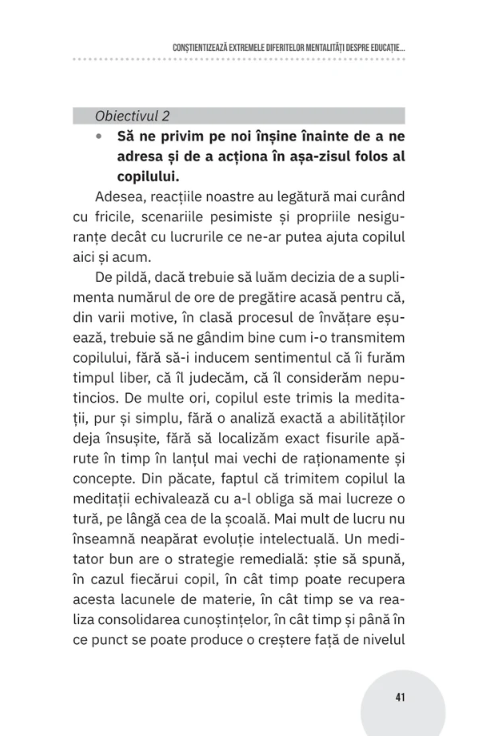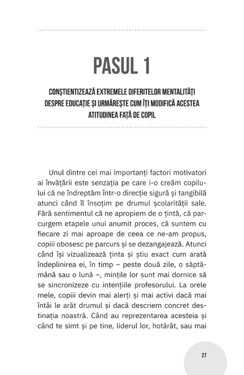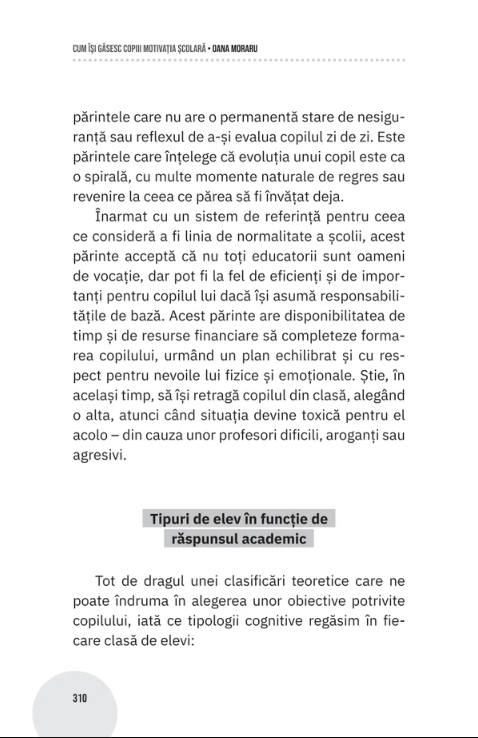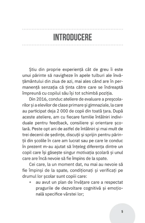 Te invit să găsim împreună un mecanism de sprijinire a copiilor noștri pe drumul lor școlar, cu obiectivul principal de a le menține motivația activă. Ca să ne putem ajuta copiii în acest sens, este nevoie să parcurgem fiecare dintre etapele descrise în acest volum, cu încrederea că ne-am ales un drum și o metodă, suficient de coerente și de eficiente pentru liniștea noastră și a copiilor.