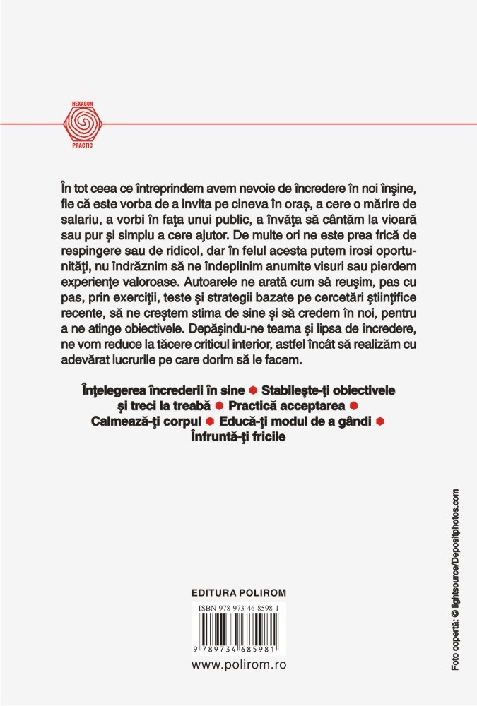 În tot ceea ce întreprindem avem nevoie de încredere în noi înșine, fie că este vorba de a invita pe cineva în oraș, a cere o mărire de salariu, a vorbi în fața unui public, a învăța să cântăm la vioară sau pur și simplu a cere ajutor. De multe ori ne este prea frică de respingere sau de ridicol, dar în felul acesta putem irosi oportunități, nu îndrăznim să ne îndeplinim anumite visuri sau pierdem experiențe valoroase. Autoarele ne arată cum să reușim, pas cu pas, prin exerciții, teste și strategii bazate pe cercetări științifice recente, să ne creștem stima de sine și să credem în noi, pentru a ne atinge obiectivele. Depășindu-ne teama și lipsa de încredere, ne vom reduce la tăcere criticul interior, astfel încât să realizăm cu adevărat lucrurile pe care dorim să le facem.
