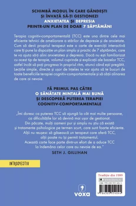 Terapia cognitiv-comportamentală (TCC) este una dintre cele mai eficiente tehnici de ameliorare a stărilor de depresie și de anxietate. Cum să devii propriul terapeut este o carte de exerciții interactivă care îți pune la dispoziție un plan simplu și practic de 7 săptămâni, care te va ajuta să-ți alini anxietatea și depresia. Dacă nu ești familiarizat cu acest tip de terapie, volumul cuprinde și explicații ale bazelor TCC, astfel încât să poți progresa în propriul ritm, atunci când ești pregătit. Lecțiile simple, directe și ușor de înțeles te vor ajuta să te bucuri de toate beneficiile terapiei cognitiv-comportamentale și să obții alinarea de care ai nevoie.