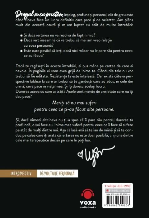 Și, dacă nimeni altcineva nu ți-a spus că îi pare rău pentru durerea ta profundă, o voi face eu. Inima mea suferă pentru ceea ce îi face să sufere pe atât de mulți dintre noi. Așa că lasă-mă să te iau de mână și să te conduc pe calea care îți arată că iertarea nu este doar posibilă, ci și una dintre cele mai terapeutice decizii pe care le poți lua.