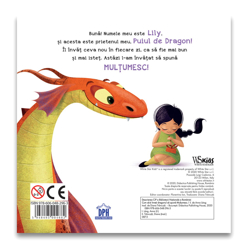 Cum să-ți înveți dragonul să spună MULȚUMESC, o carte potrivită copiilor cu vârsta peste 2 ani, îi invită pe aceștia să descopere cum a învățat puiul de dragon să spună MULȚUMESC.