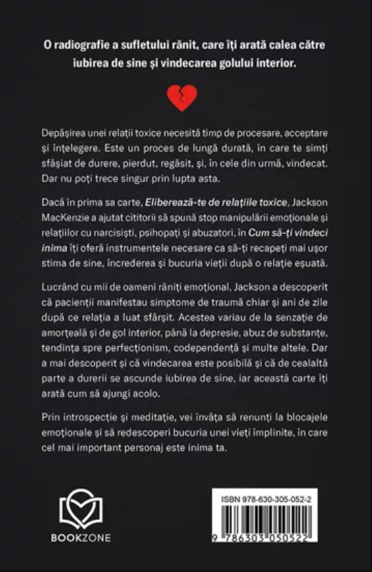 Depășirea unei relații toxice necesită timp de procesare, acceptare și înțelegere. Dar nu poți trece singur prin lupta asta. Prin această carte, Jackson MacKenzie îți oferă instrumentele necesare ca să-ți recapeți mai ușor stima de sine, încrederea și bucuria vieții după o relație eșuată.