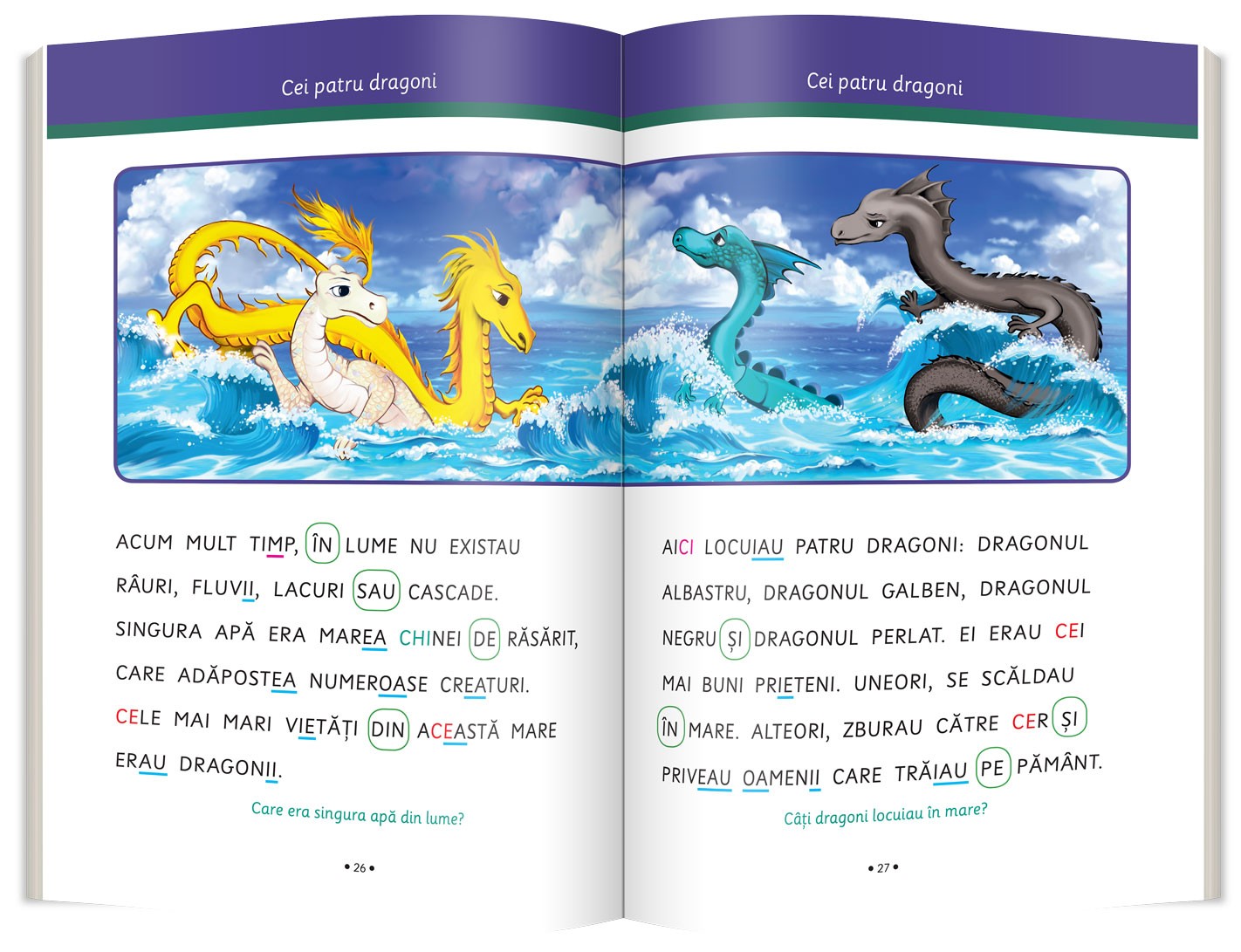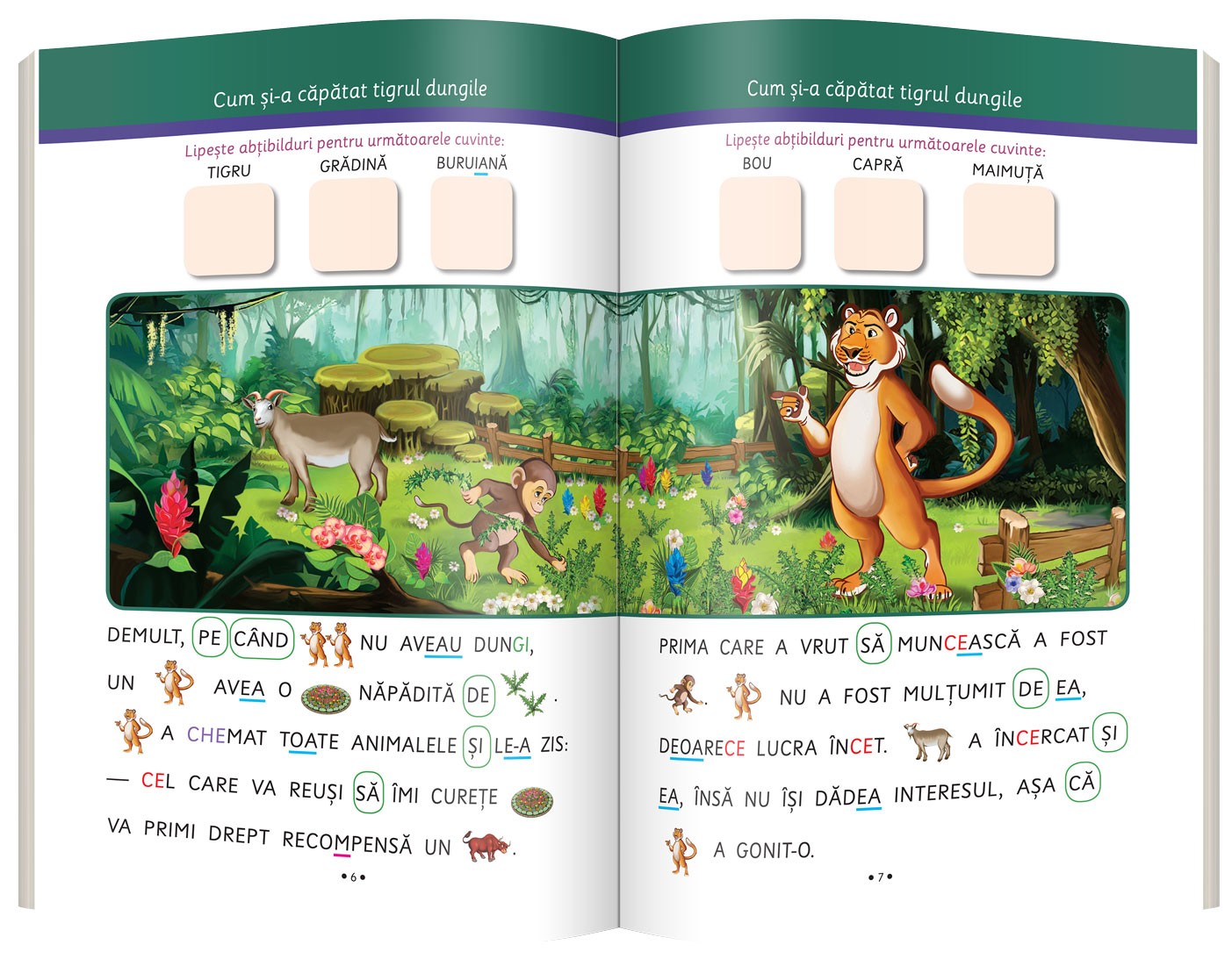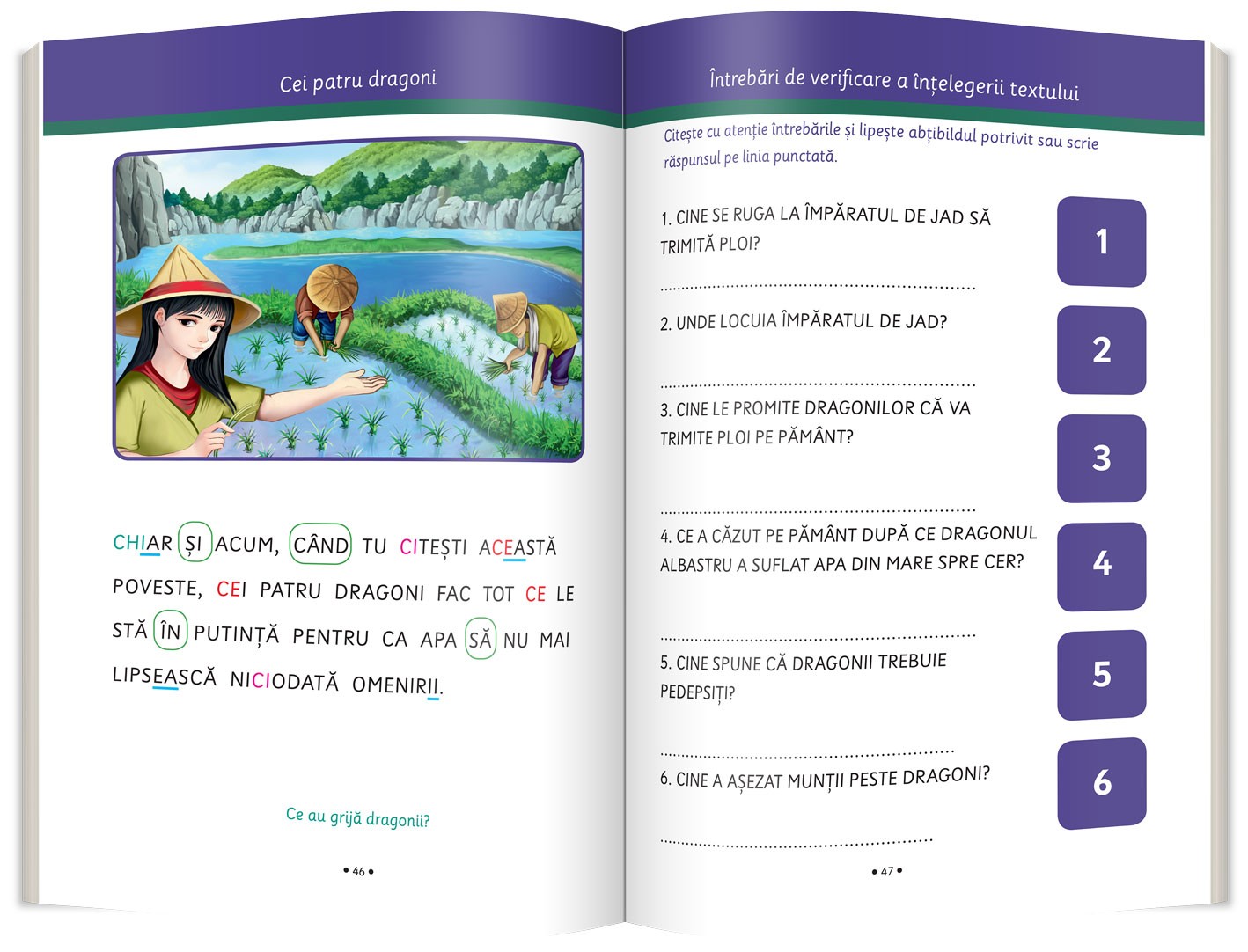 Din a doua poveste lipsesc pictogramele, dar majusculele și evidențierile au fost păstrate. În josul paginii sunt întrebări legate de text.