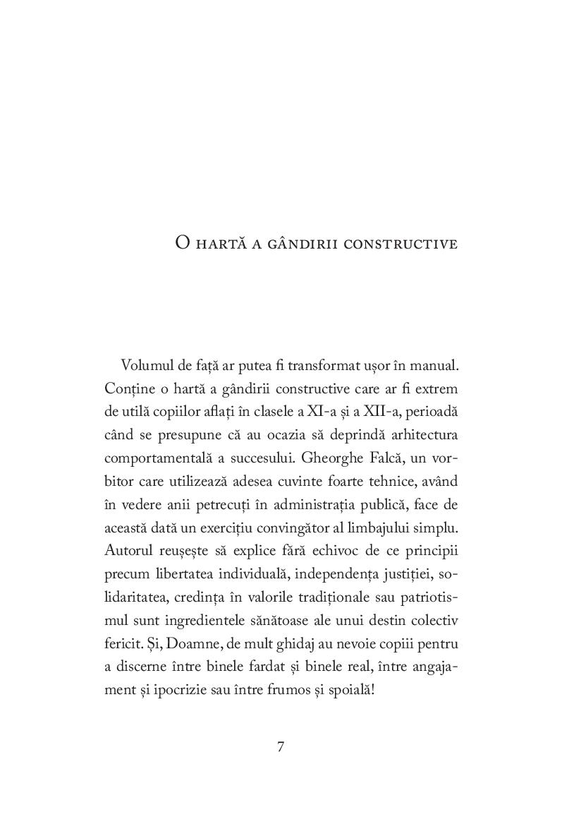 În această carte, un om politic român visează. Asta, deja, e suficient în sine! Asemenea oameni politici sînt rari la noi. La prima vedere, ar putea fi o carte despre trecut. Dar în lumea visului, trecutul și viitorul sînt totuna, iar prezentul este momentul în care îți dai seama de asta. Poți avea observații ici-colo la istoria politică recentă povestită de Gheorghe Falcă, desigur. Dar ai face-o doar dacă ai crede că ai în față o carte de istorie. Însă această carte vorbește despre viitor. Și orice om înțelept știe că va găsi coordonatele viitorului, dacă va căuta atent urmele trecutului. - Sever Voinescu