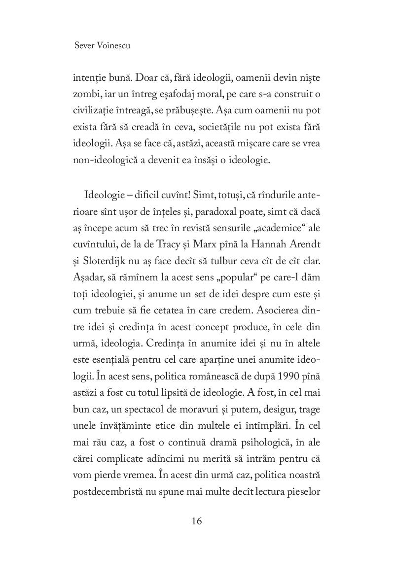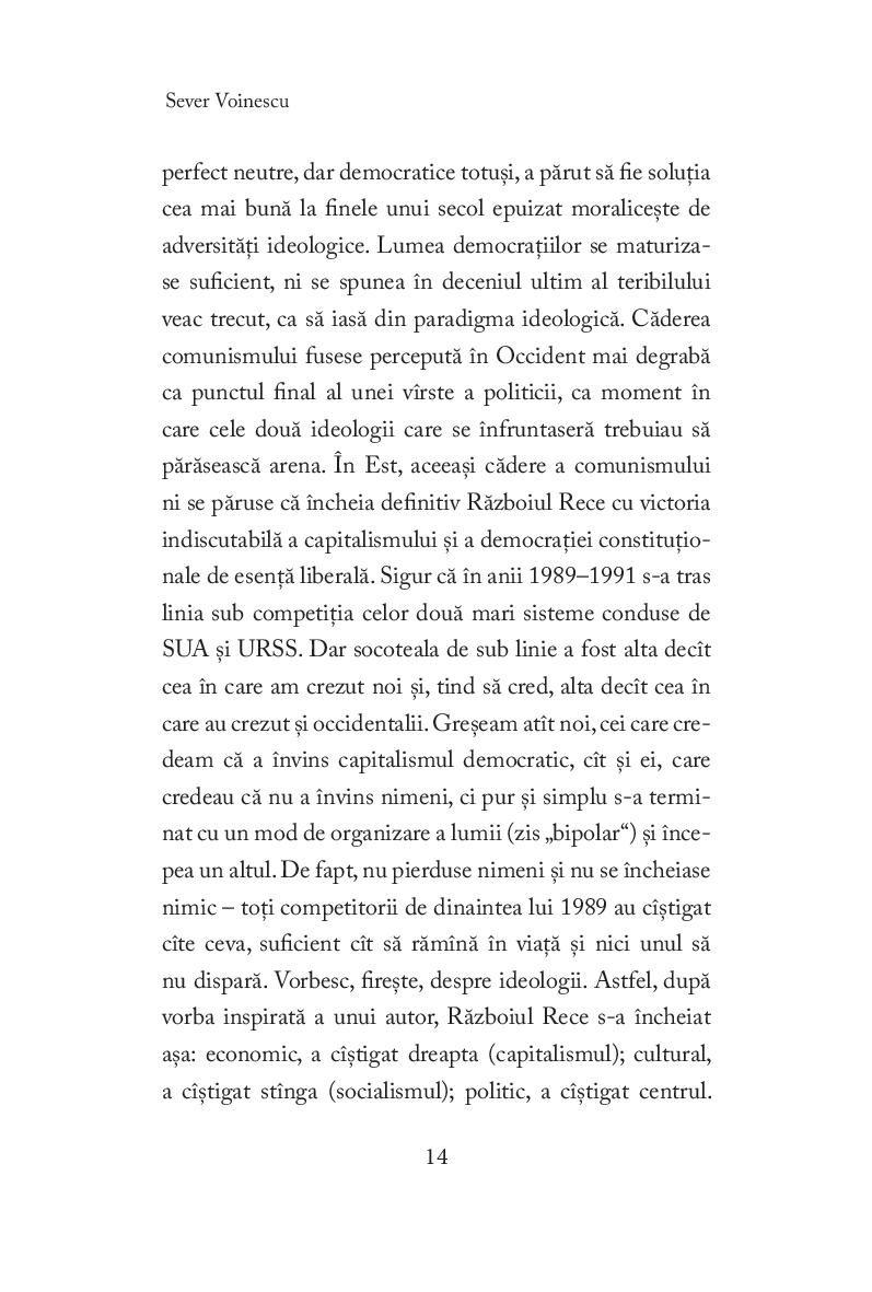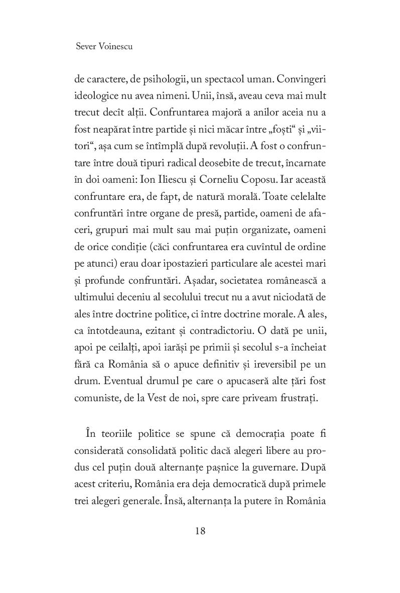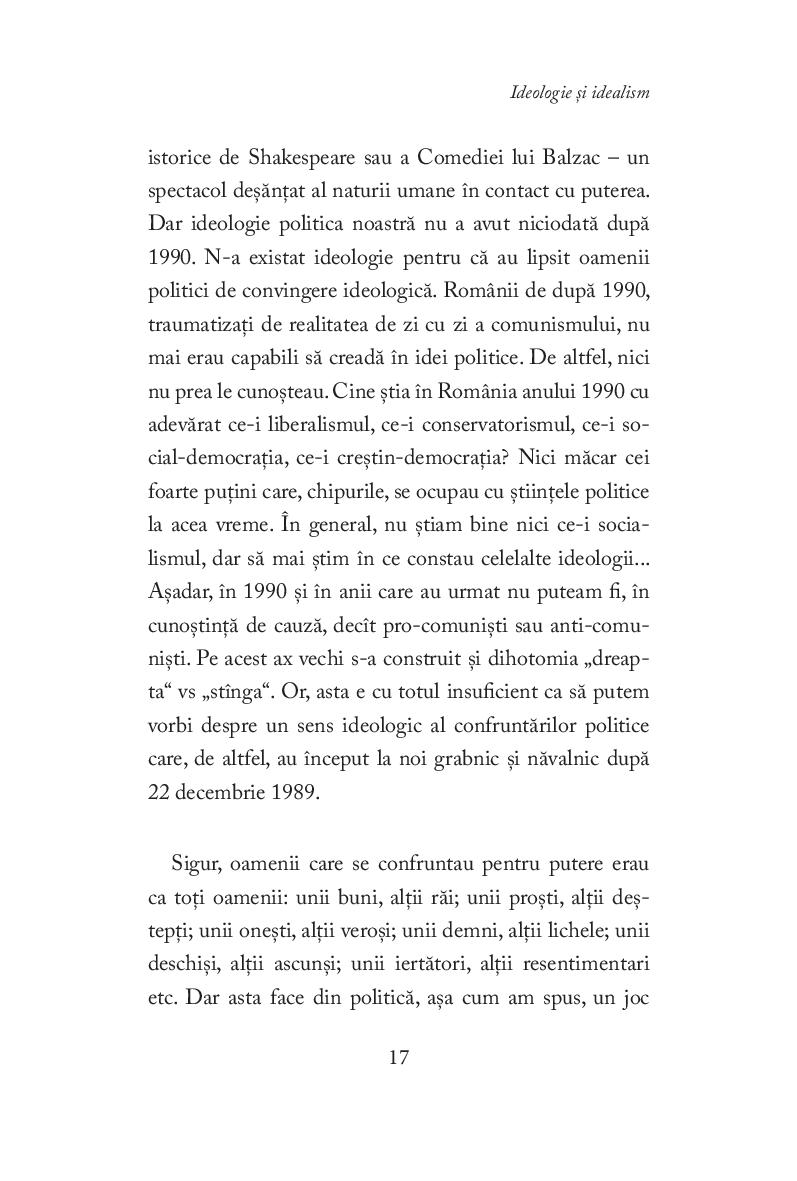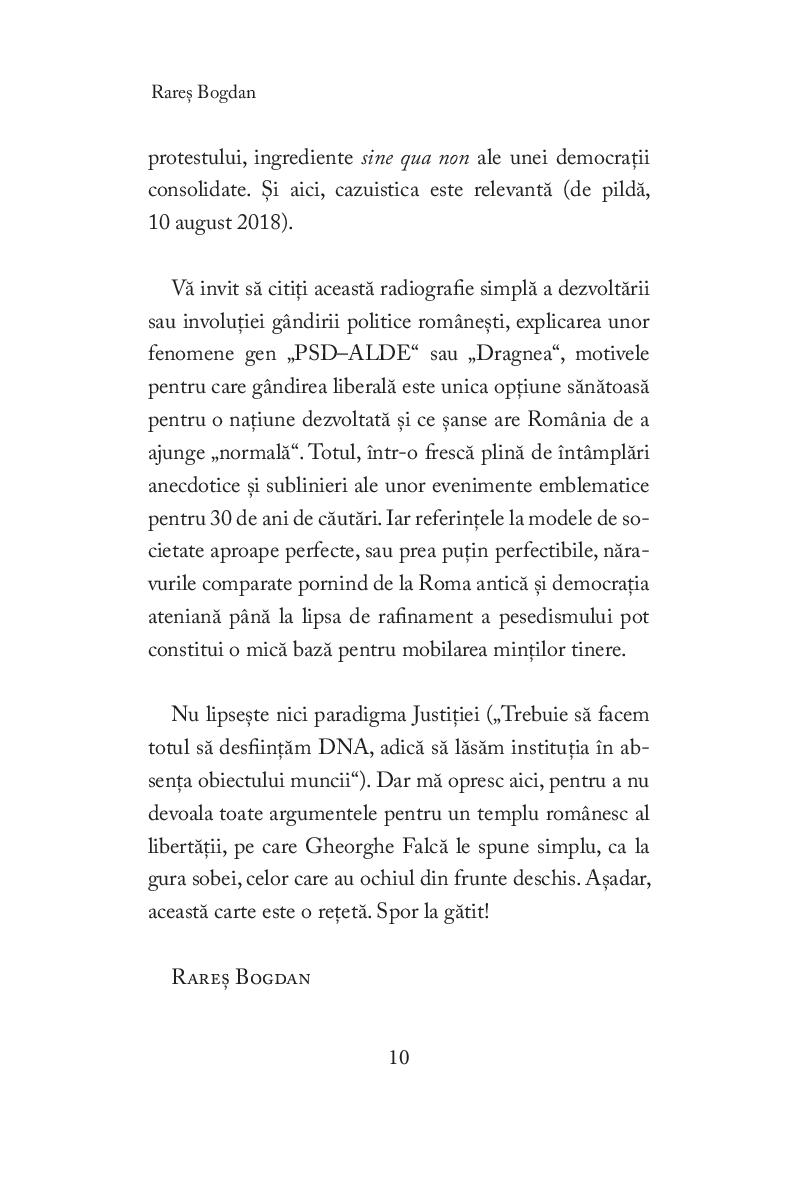 Vă invit să citiți această radiografie simplă a dezvoltării sau involuției gândirii politice românești, explicarea unor fenomene gen „PSD-ALDE“ sau „Dragnea“, motivele pentru care gândirea liberală este unica opțiune sănătoasă pentru o națiune dezvoltată și ce șanse are România să ajungă „normală“. Totul, într-o frescă plină de întâmplări anecdotice și sublinieri ale unor evenimente emblematice pentru 30 de ani de căutări. Iar referințele la modele de societate aproape perfecte sau prea puțin perfectibile, năravurile comparate pornind de la Roma antică și democrația ateniană până la lipsa de rafinament a pesedismului, pot constitui o mică bază pentru mobilarea minților tinere. - Rareș Bogdan