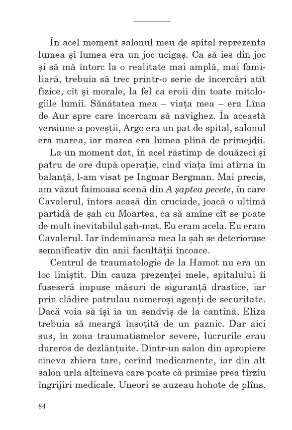 „N‑am văzut cuțitul sau cel puțin nu‑l țin minte. Nu știu dacă a fost unul lung sau scurt, cu lama lată, de vânătoare, sau îngustă, ca un stilet, zimțată ca la un cuțit de pâine sau curbată ca o seceră, un briceag de copil al străzii sau chiar un cuțit obișnuit de tăiat carnea, furat din bucătăria maică‑sii. Nici nu‑mi pasă. Arma aceea nevăzută a fost suficient de utilă și și‑a făcut treaba.” (Salman Rushdie)