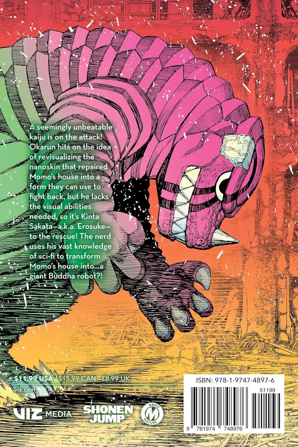 A seemingly unbeatable kaiju is on the attack! Okarun hits on the idea of revisualizing the nanoskin that repaired Momo’s house into a form they can use to fight back, but he lacks the imagination needed, so it’s Kinta Sakata—a.k.a. Erosuke—to the rescue! The nerd uses his vast knowledge of sci-fi to transform Momo’s house into…a giant Buddha robot?!