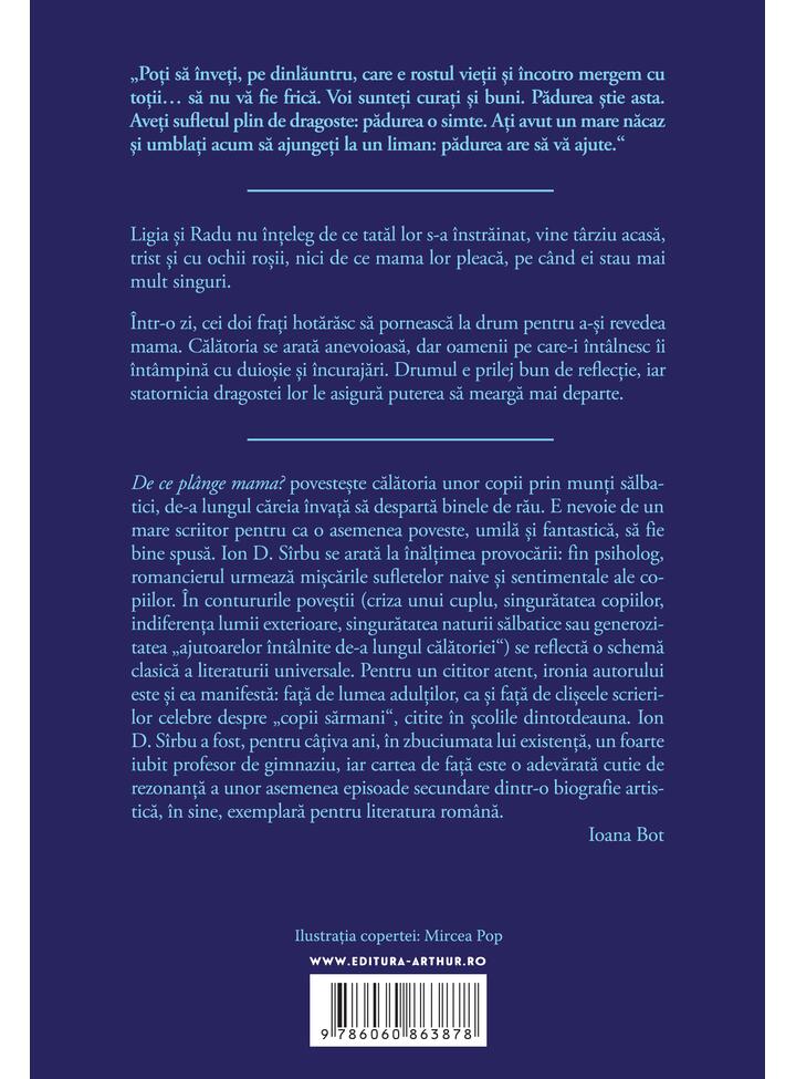 De ce plânge mama? povestește călătoria unor copii prin munți sălbatici, de-a lungul căreia învață să despartă binele de rău. E nevoie de un mare scriitor pentru ca o asemenea poveste, umilă și fantastică, să fie bine spusă. Ion D. Sîrbu se arată la înălțimea provocării: fin psiholog, romancierul urmează mișcările sufletelor naive și sentimentale ale copiilor. În contururile poveștii (criza unui cuplu, singurătatea copiilor, indiferența lumii exterioare, singurătatea naturii sălbatice sau generozitatea ,,ajutoarelor întâlnite de-a lungul călătoriei") se reflectă o schemă clasică a literaturii universale. Pentru un cititor atent, ironia autorului este și ea manifestă: față de lumea adulților, ca și față de clișeele scrierilor celebre despre ,,copii sărmani", citite în școlile dintotdeauna. Ion D. Sîrbu a fost, pentru câțiva ani, în zbuciumata lui existență, un foarte iubit profesor de gimnaziu, iar cartea de față este o adevărată cutie de rezonanță a unor asemenea episoade secundare dintr-o biografie artistică, în sine, exemplară pentru literatura română. Ioana Bot