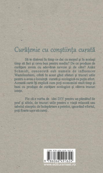 Sa te distrezi in timp ce dai cu mopul si in acelasi timp sa faci si ceva bun pentru mediu? De ce produse de curatare avem cu adevarat nevoie si de cate? Anke Schmidt, cunoscuta sub numele de influencer Wastelesshero, ofera in acest ghid sfaturi si trucuri utile pentru a avea o locuinta curata si ecologica cu putin efort. Aceasta carte iti explica cum poti economisi mult timp si bani cu produse de curatare ecologice si cateva trucuri istete.