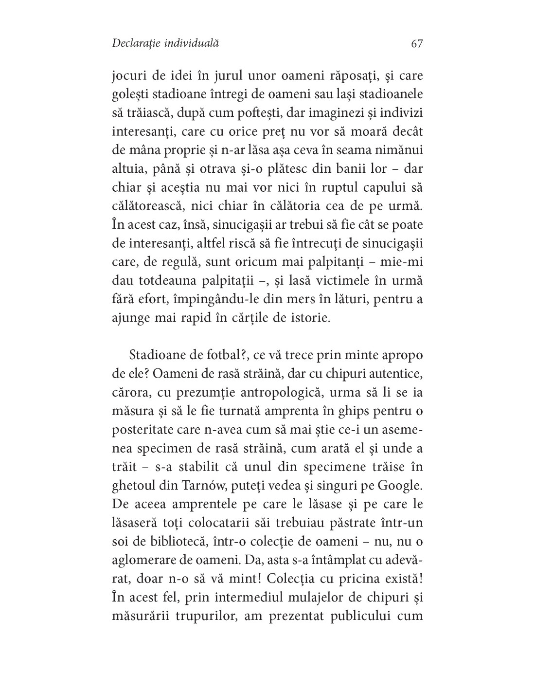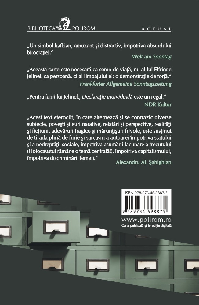Şi care sunt schemele actuale de evitare a impozitelor sau scandalurile de fraudă gen Cum-Ex, în care a fost implicat, spre exemplu, procesatorul de plăţi Wirecard? Pe cât de autobiografică, pe atât de universală, pe cât de sarcastică, pe atât de inflamată, Declaraţie individuală ne dezvăluie o Elfriede Jelinek care îşi reglează conturile nu doar cu ea însăşi, ci şi cu societatea, care pare mai preocupată de răufăcători decât de victime, urmărind ramificaţiile tranzacţiilor financiare, ce reprezintă unul dintre marile secrete ale economiei moderne.