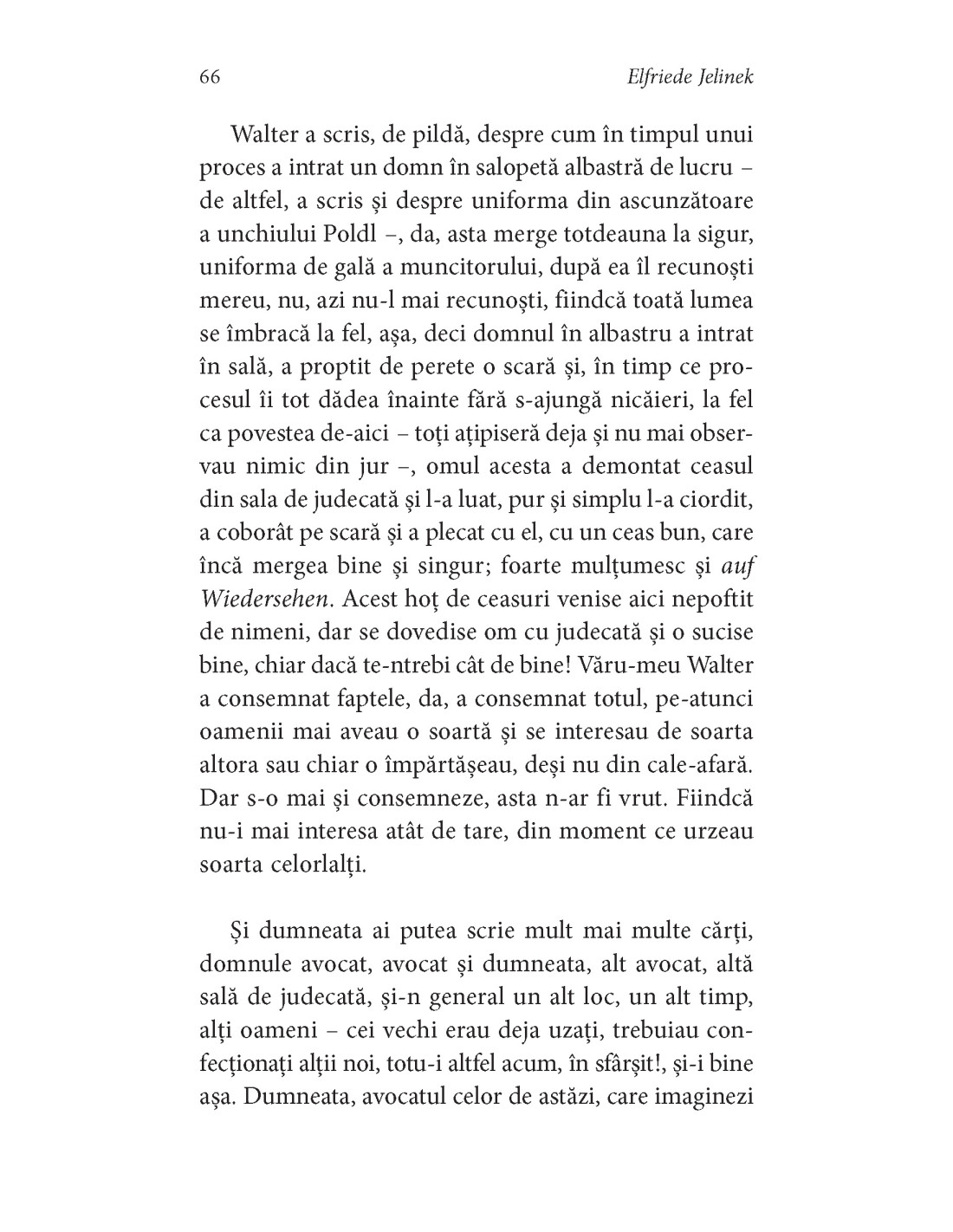 „Această carte este necesară ca semn de viaţă, nu al lui Elfriede Jelinek ca persoană, ci al limbajului ei: o demonstraţie de forţă.” (Frankfurter Allgemeine Sonntagszeitung)