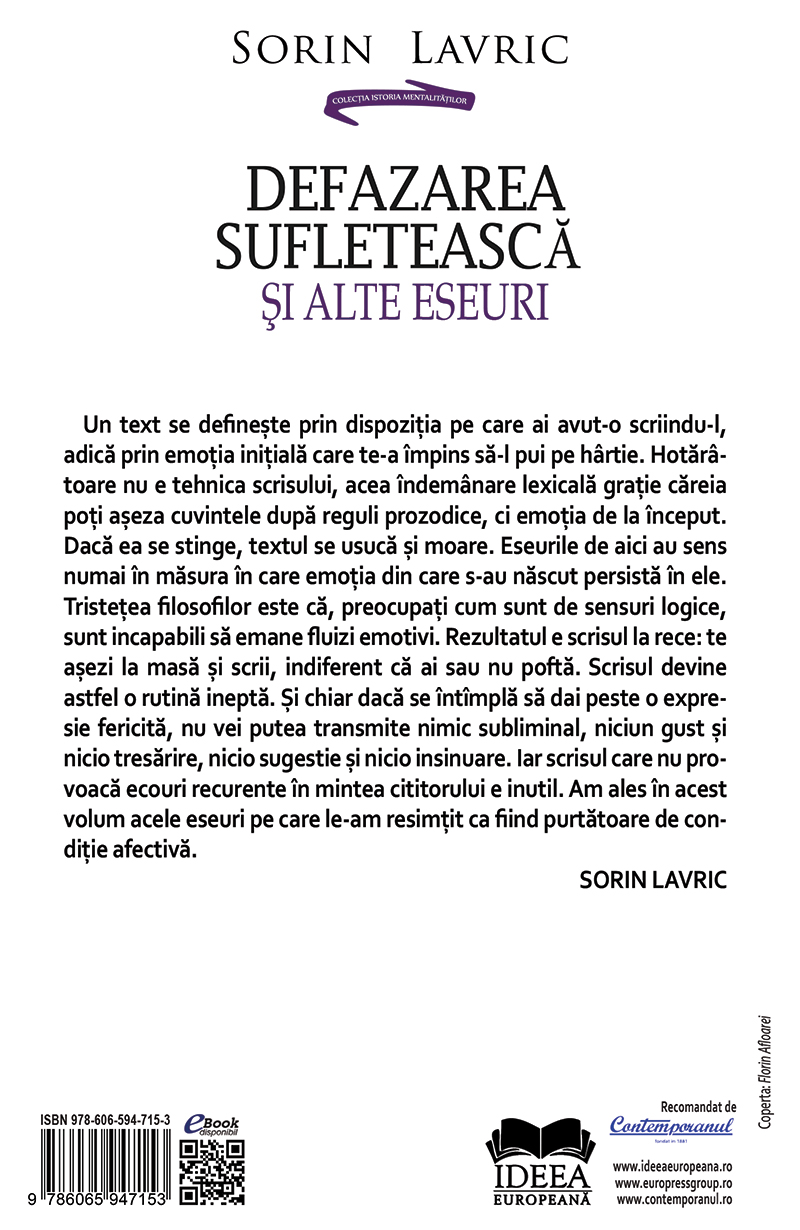 Rezultatul e scrisul la rece: te aşezi la masă şi scrii, indiferent că ai sau nu poftă. Scrisul devine astfel o rutină ineptă. Şi chiar dacă se întîmplă să dai peste o expresie fericită, nu vei putea transmite nimic subliminal, niciun gust şi nicio tresărire, nicio sugestie şi nicio insinuare. Iar scrisul care nu provoacă ecouri recurente în mintea cititorului e inutil. Am ales în acest volum acele eseuri pe care le‑am resimţit ca fiind purtătoare de condiţie afectivă. / Sorin Lavric