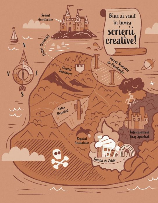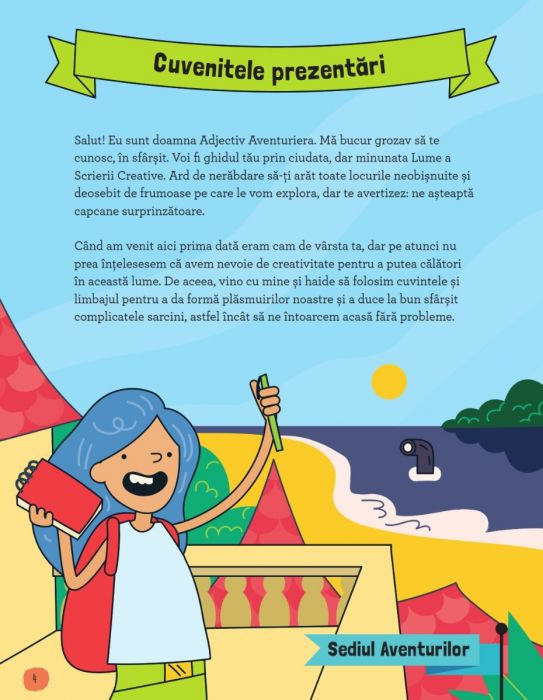 Ghidează-i pe cei doi aventurieri, doamna Adjectiv și cățelul Zbârlici, prin Lumea Scrierii Creative. Vei descoperi 18 peisaje inventate, cu un uriaș potențial de a da naștere unor povești.