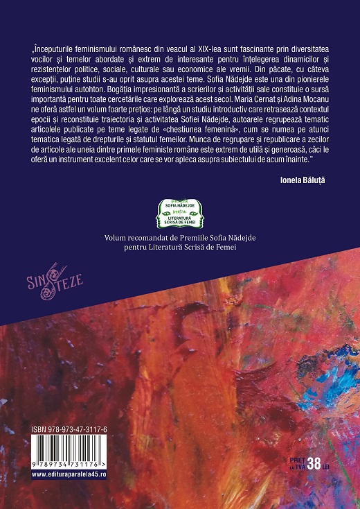 „Începuturile feminismului românesc din veacul al XIX-lea sunt fascinante prin diversitatea vocilor și temelor abordate și extrem de interesante pentru înțelegerea dinamicilor și rezistențelor politice, sociale, culturale sau economice ale vremii. Din păcate, cu câteva excepții, puține studii s-au oprit asupra acestei teme. Sofia Nădejde este una din pionierele feminismului autohton. Bogăția impresionantă a scrierilor și activității sale constituie o sursă importantă pentru toate cercetările care explorează acest secol. Maria Cernat și Adina Mocanu ne oferă astfel un volum foarte prețios: pe lângă un studiu introductiv care retrasează contextul epocii și reconstituie traiectoria și activitatea Sofiei Nădejde, autoarele regrupează tematic articolele publicate pe teme legate de «chestiunea femenină», cum se numea pe atunci tematica legată de drepturile și statutul femeilor. Munca de regrupare și republicare a zecilor de articole ale uneia dintre primele feministe române este extrem de utilă și generoasă, căci le oferă un instrument excelent celor care se vor apleca asupra subiectului de acum înainte.” - Ionela Băluță
