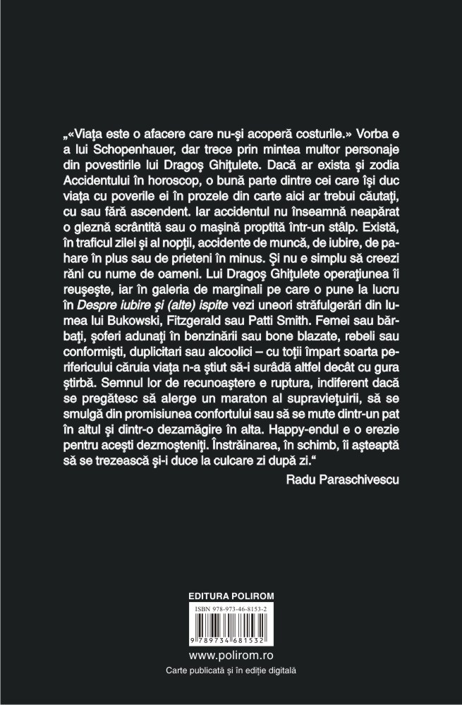 „«Viața este o afacere care nu-și acoperă costurile.» Vorba e a lui Schopenhauer, dar trece prin mintea multor personaje din povestirile lui Dragoș Ghițulete. Dacă ar exista și zodia Accidentului în horoscop, o bună parte dintre cei care își duc viața cu poverile ei în prozele din carte aici ar trebui căutați, cu sau fără ascendent. Iar accidentul nu înseamnă neapărat o gleznă scrîntită sau o mașină proptită într-un stîlp. Există, în traficul zilei și al nopții, accidente de muncă, de iubire, de pahare în plus sau de prieteni în minus. Și nu e simplu să creezi răni cu nume de oameni. Lui Dragoș Ghițulete operațiunea îi reușește, iar în galeria de marginali pe care o pune la lucru în Despre iubire și (alte) ispite vezi uneori străfulgerări din lumea lui Bukowski, Fitzgerald sau Patti Smith. Femei sau bărbați, șoferi adunați în benzinării sau bone blazate, rebeli sau conformiști, duplicitari sau alcoolici – cu toții împart soarta perifericului căruia viața n-a știut să-i surîdă altfel decît cu gura știrbă. Semnul lor de recunoaștere e ruptura, indiferent dacă se pregătesc să alerge un maraton al supraviețuirii, să se smulgă din promisiunea confortului sau să se mute dintr-un pat în altul și dintr-o dezamăgire în alta. Happy-endul e o erezie pentru acești dezmoșteniți. Înstrăinarea, în schimb, îi așteaptă să se trezească și-i duce la culcare zi după zi.” (Radu Paraschivescu)