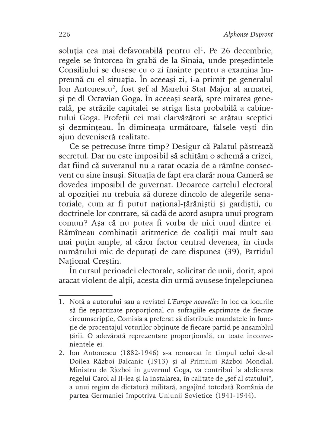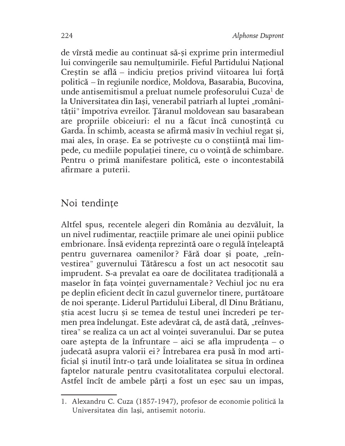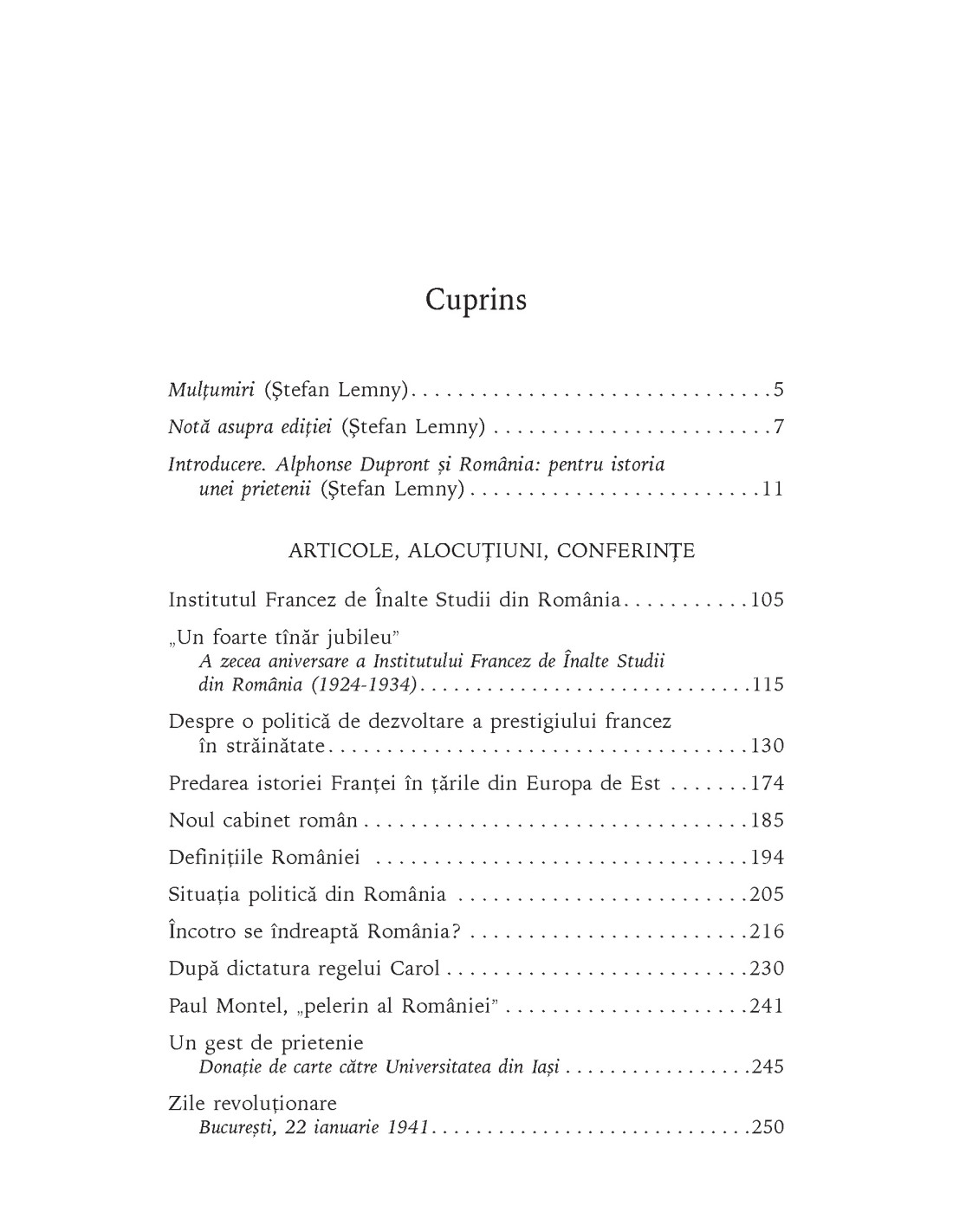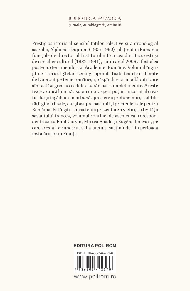 Prestigios istoric al sensibilităților colective și antropolog al sacrului, Alphonse Dupront (1905-1990) a deținut în România funcțiile de director al Institutului Francez din București și de consilier cultural (1932-1941), iar în anul 2006 a fost ales post-mortem membru al Academiei Române. Volumul îngrijit de istoricul Ștefan Lemny cuprinde toate textele elaborate de Dupront pe teme românești, răspândite prin publicații care sunt astăzi greu accesibile sau rămase complet inedite. Aceste texte aruncă lumină asupra unui aspect puțin cunoscut al creației lui și îngăduie o mai bună apreciere a profunzimii și subtilității gândirii sale, dar și asupra pasiunii și prieteniei sale pentru România. Pe lângă o consistentă prezentare a vieții și activității savantului francez, volumul conține, de asemenea, corespondența sa cu Emil Cioran, Mircea Eliade și Eugène Ionesco, pe care acesta i-a cunoscut și i-a prețuit, susținându-i în perioada instalării lor în Franța.