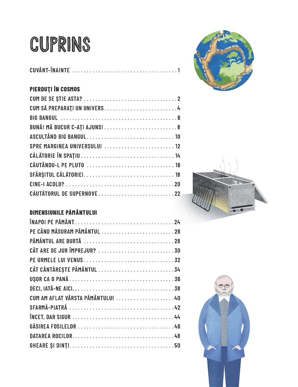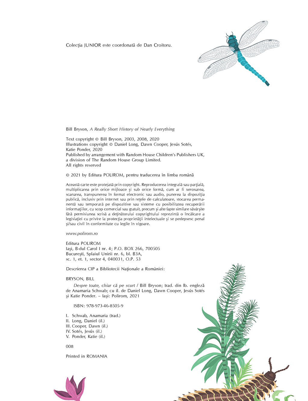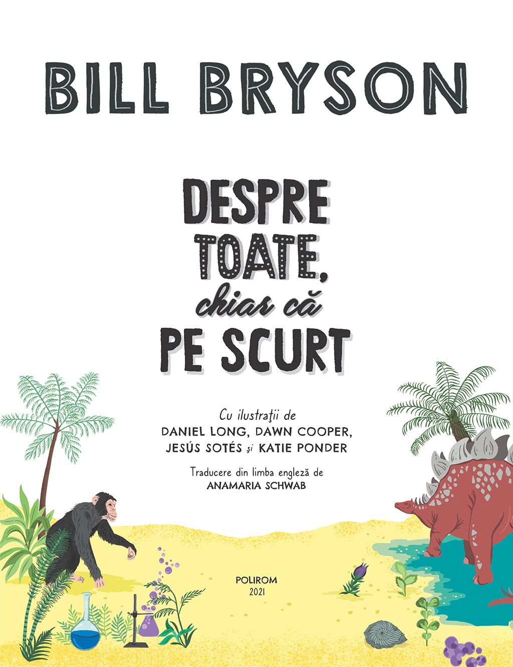 Cu talentul său de povestitor, Bill Bryson face distractive și accesibile oricărei vârste răspunsurile la tipicele întrebări „Cum?” și „Cine?” din cadrul descoperirilor științifice. În această nouă și captivantă ediție a bestsellerului său internațional Despre toate, pe scurt, special adaptată pentru cititorii mai tineri, Bill Bryson explorează misterele timpului și ale spațiului și modul în care, cu totul surprinzător, a apărut viața pe minunata planetă care e pentru noi „acasă”. În călătoria noastră, dăm peste mai mulți savanți ciudați, teorii aiuristice care au avut o influență majoră mult prea mult timp și unele descoperiri întâmplătoare ce au schimbat felul în care a evoluat știința.