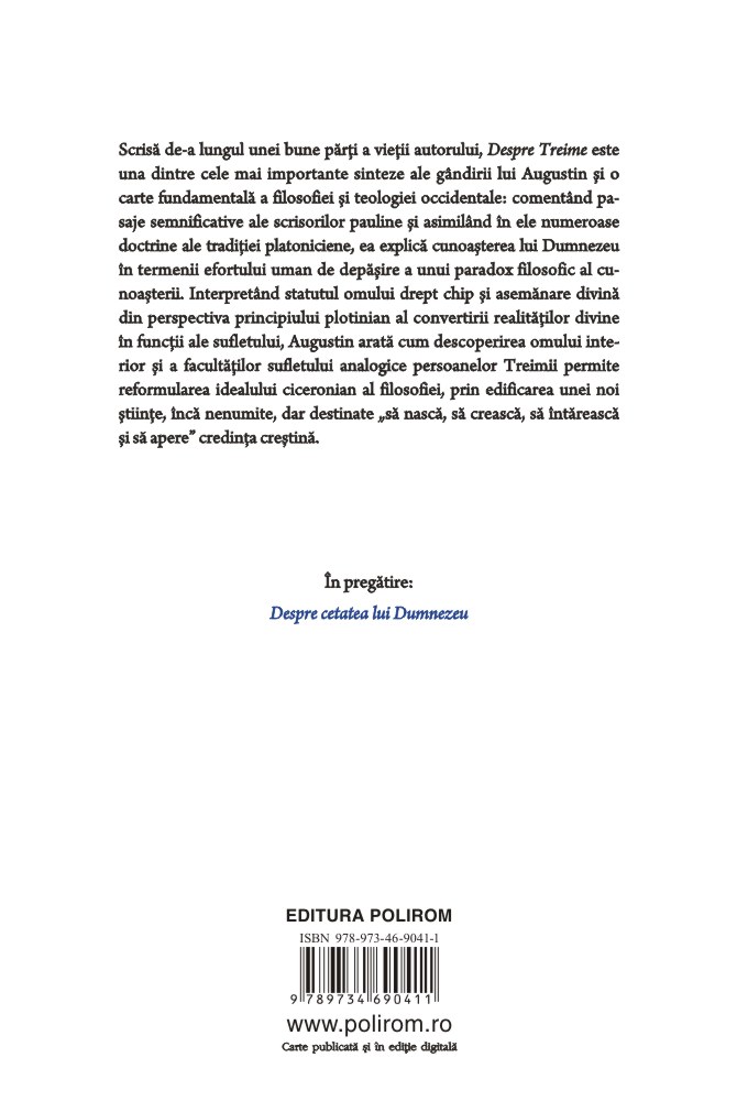 Scrisă de-a lungul unei bune părţi a vieţii autorului, Despre Treime este una dintre cele mai importante sinteze ale gândirii lui Augustin și o carte fundamentală a filosofiei și teologiei occidentale: comentând pasaje semnificative ale scrisorilor pauline și asimilând în ele numeroase doctrine ale tradiţiei platoniciene, ea explică cunoașterea lui Dumnezeu în termenii efortului uman de depășire a unui paradox filosofic al cunoașterii. Interpretând statutul omului drept chip și asemănare divină din perspectiva principiului plotinian al convertirii realităţilor divine în funcţii ale sufletului, Augustin arată cum descoperirea omului interior și a facultăţilor sufletului analogice persoanelor Treimii permite reformularea idealului ciceronian al filosofiei, prin edificarea unei noi știinţe, încă nenumite, dar destinate „să nască, să crească, să întărească și să apere” credinţa creștină.