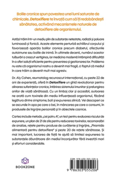 Dr. Aly Cohen, reumatolog recunoscut international, cu peste 22 de ani de experienţă, oferă în Detoxifiere un ghid revolutionar pentru alinarea suferinţelor cronice, întărirea sistemului imunitar şi prelungirea anilor de viaţă sănătoasă. Într-un limbaj clar şi accesibil, autoarea ne arată cum toxinele din mediu influențează organismul, făcând legătura dintre simptome, boli şi expunerea zilnică. Vei descoperi ce se ascunde în apa pe care o bei, în mâncarea pe care o consumi, în produsele de îngrijire personală şi în obiectele casnice.