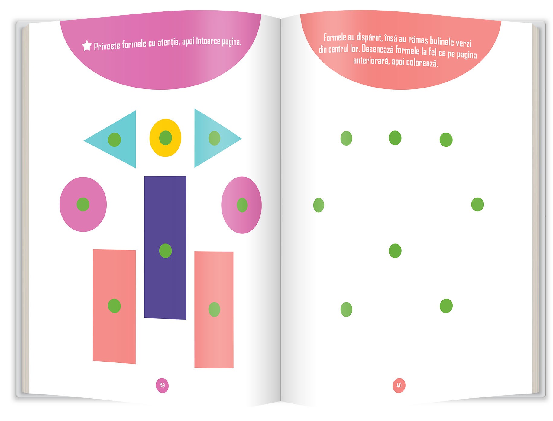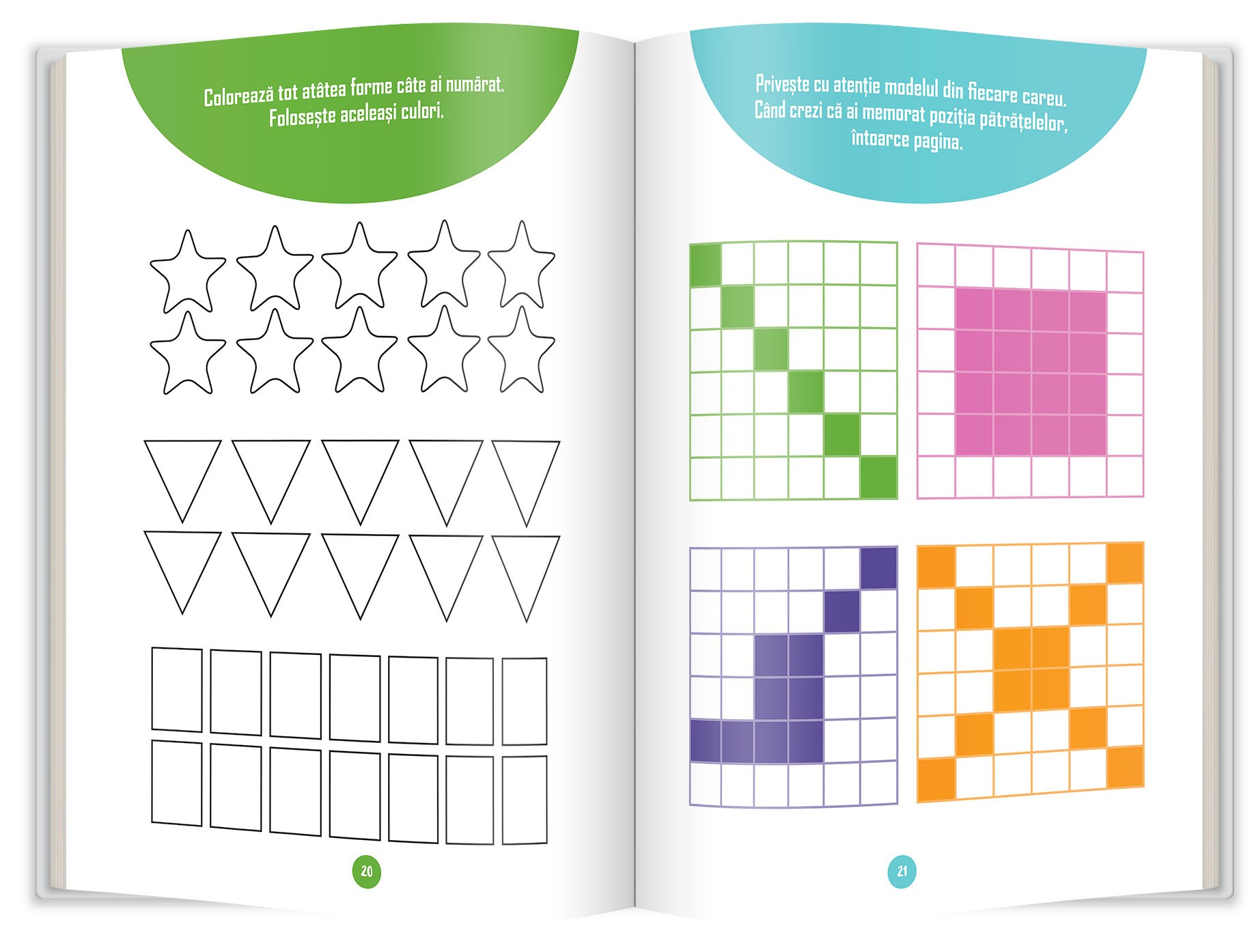 DEZVOLTĂ-ȚI MEMORIA conține activități ideale pentru îmbunătățirea capacității de memorare vizuală a copilului. Rezolvarea exercițiilor propuse îi vor spori concentrarea și atenția la detalii, iar el va reuși să rețină cu mai multă ușurință informațiile, ceea ce îi va fi de mare folos la școală.