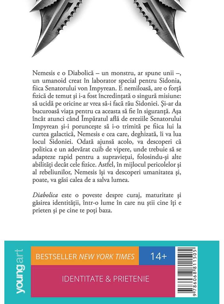 Nemesis e o Diabolică – un monstru, ar spune unii –, un umanoid creat în laborator special pentru Sidonia, fiica Senatorului von Impyrean. E nemiloasă, are o forţă fizică de temut şi i-a fost încredinţată o singură misiune: să ucidă pe oricine ar vrea să-i facă rău Sidoniei. Şi-ar da bucuroasă viaţa pentru ca aceasta să fie în siguranţă. Aşa încât atunci când Împăratul află de ereziile Senatorului Impyrean şi-i porunceşte să i-o trimită pe fiica lui la curtea galactică, Nemesis e cea care, deghizată, îi va lua locul Sidoniei. Odată ajunsă acolo, va descoperi că politica e un adevărat cuib de vipere, unde trebuie să se adapteze rapid pentru a supravieţui, folosindu-şi alte abilităţi decât cele fizice. Astfel, în mijlocul pericolelor şi al rebeliunilor, Nemesis îşi va descoperi umanitatea şi, poate, va găsi calea de a salva lumea.
