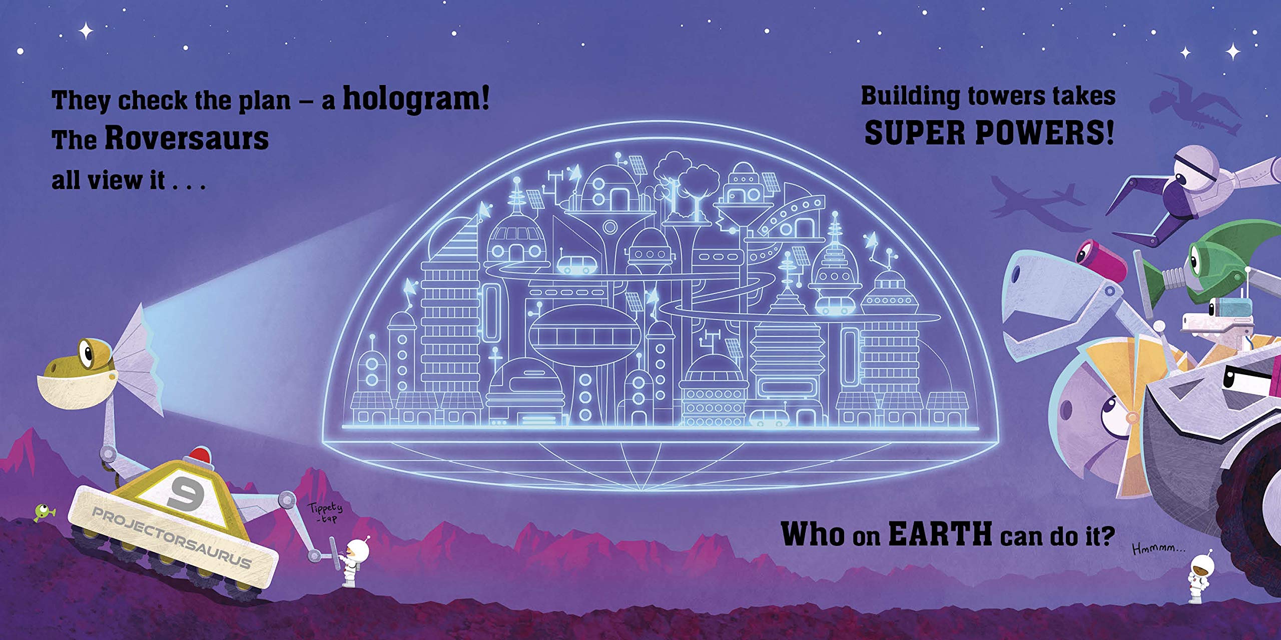 While Diggersaurs work hard outdoors shifting earth and granite,Work takes place in outer space upon a distant planet . . .