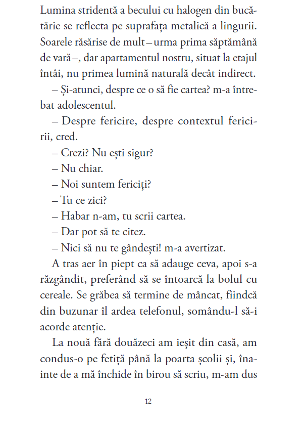 Un scriitor (întâmplător sau nu, având același nume cu autorul) duce o existență cât se poate de mulțumitoare: singurul conflict autentic din viața lui, după cum ne anunță chiar de la început, este încăpățânarea de a scrie, când, după toate aparențele, nu are de ce. În lipsă de alte frământări, observă în tihnă lumea din jur și începe să ne povestească pe un ton firesc lucruri banale care i se întâmplă, în cartier și prin împrejurimi: o vizită la o clinică de gastroenterologie, prezentarea unor cursuri de scriere creativă la o librărie sau un drum la frizer. Dar intră în scenă două recepționere cârcotașe, un paznic de supermarket cu veleități de scriitor și o frizeriță bretonă care poartă cu ea un secret neliniștitor, și totul iese pe nesimțite din cotidian. Pe măsură ce lucrurile devin mai bizare, realitatea și ficțiunea se amestecă până la confundare, mai ales când personaj principal ajunge să fie un buclucaș deget tăiat...
