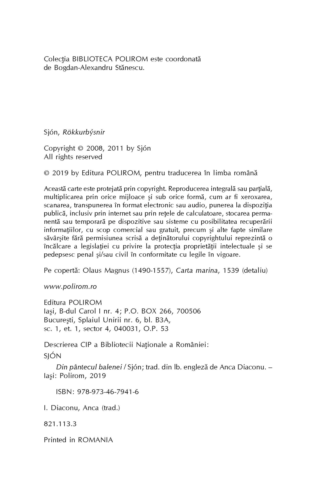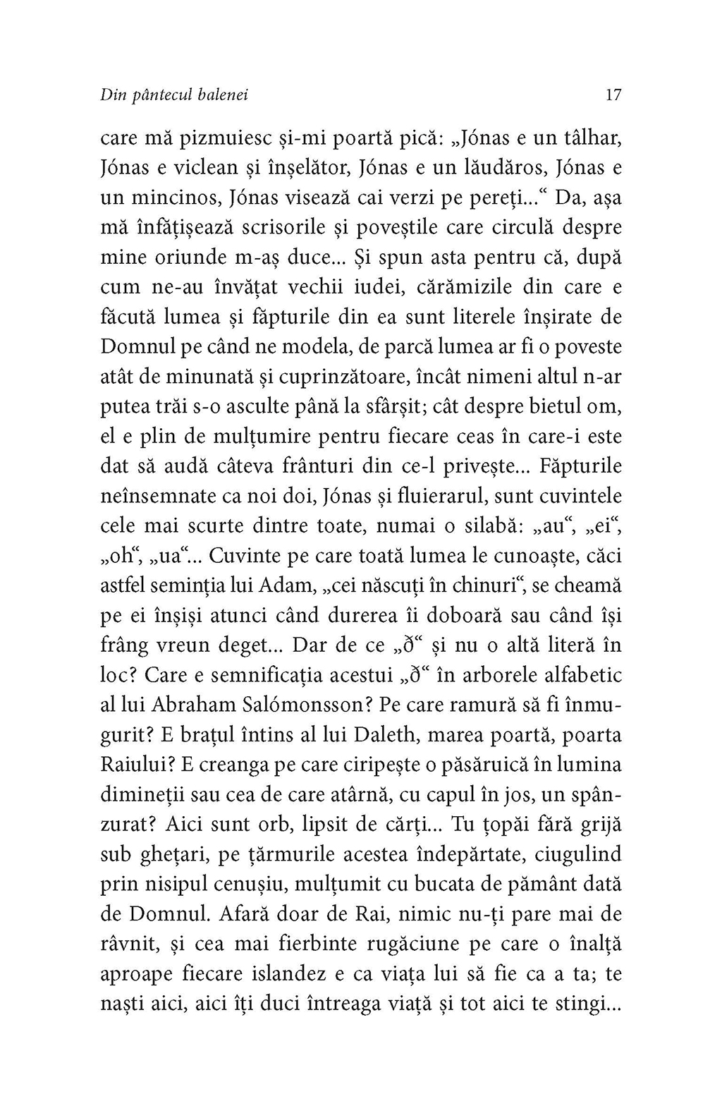 Islanda anului 1635 este o lume macinata de saracie, boala si cruzime, in care nu poti supravietui decit daca te pui sub protectia conducatorilor laici sau religiosi. Dar Jonas Palmason staruie sa-si croiasca singur drumul in viata, fapt ce trezeste neincetat suspiciuni. Isi cistiga traiul ca poet itinerant, tamaduitor si, ocazional, exorcist, incercind sa-si intretina mica familie. Totusi, cind refuza sa ia parte, alaturi de taranii minati de lacomie din satul lui, la masacrul vinatorilor de balene basci care venisera la pescuit in apele nordice, este condamnat ca eretic si exilat pe o insula pustie. Asezat pe stincile ei golase, cu privirea pierduta la imensitatea lichida ce-l inconjoara, Jonas rememoreaza episoade halucinante din viata lui de pina atunci – exorcizarea mortului viu din Snjafjoll, intorsaturile surprinzatoare ale rotii destinului, moartea celor dragi. Din pintecul balenei este povestea fascinanta a unei minti patrunzatoare si a unei epoci disparute, o adevarata saga pentru lumea contemporana.