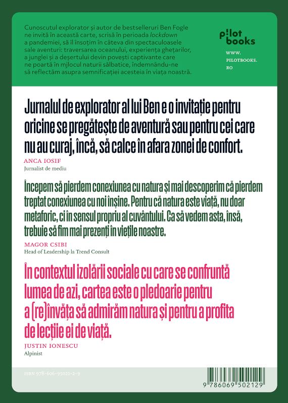 Cunoscutul explorator și autor de bestselleruri Ben Fogle ne invită în această carte, scrisă în perioada lockdown a pandemiei, să îl însoțim în câteva din spectaculoasele sale aventuri: traversarea oceanului, experiența ghețarilor, a junglei și a deșertului devin povești captivante care ne poartă în mijlocul naturii sălbatice, îndemnându-ne să reflectăm asupra semnificației acesteia în viața noastră.