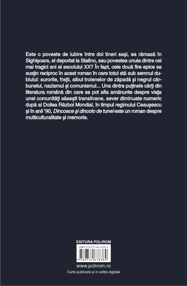 Este o poveste de iubire între doi tineri sași, ea rămasă în Sighișoara, el deportat la Stalino, sau povestea unuia dintre cei mai tragici ani ai secolului XX? În fapt, cele două fire epice se susțin reciproc în acest roman în care totul stă sub semnul dublului: surorile, frații, albul troienelor de zăpadă și negrul cărbunelui, nazismul și comunismul... Una dintre puținele cărți din literatura română din care se pot afla amănunte despre viața unei comunități săsești transilvane, sever diminuate numeric după al Doilea Război Mondial, în timpul regimului Ceaușescu și în anii ’90, Dincoace și dincolo de tunel este un roman despre multiculturalitate și memorie.