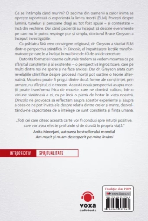 Ca psihiatru fără vreo convingere religioasă, dr. Greyson a studiat ELM dintr-o perspectivă științifică. În Dincolo, el împărtășește lecțiile transformatoare pe care le-a învățat în mai bine de 40 de ani de cercetare.