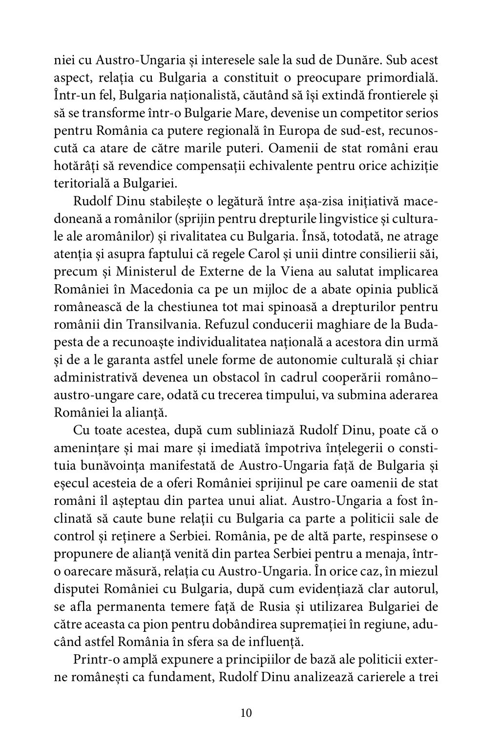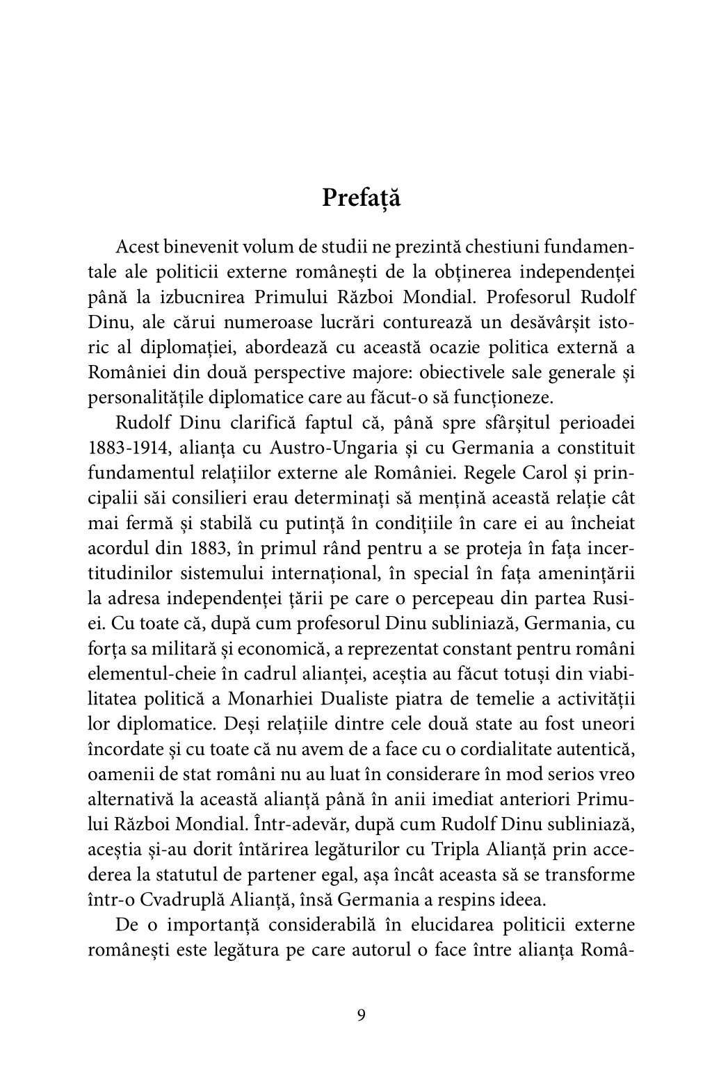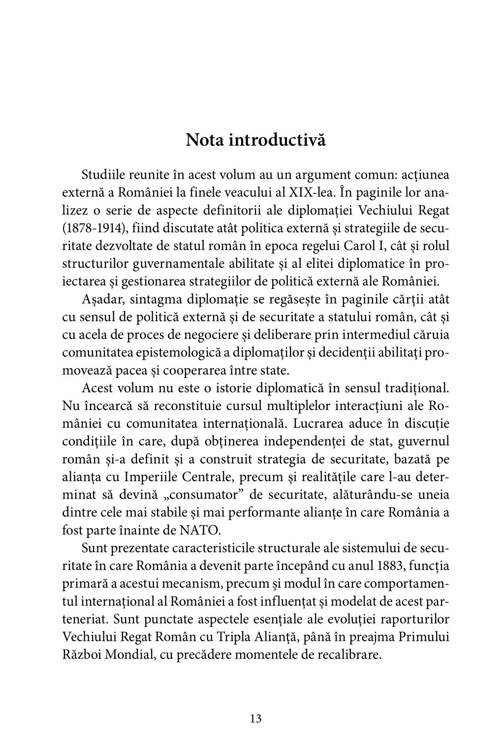 Studiile reunite în acest volum aprofundează înţelegerea noastră asupra modalităţilor în care România şi-a organizat şi condus relaţiile externe de-a lungul criticei perioade de la Independenţă la Primul Război Mondial. Ele ne vorbesc, de asemenea, despre personajele care au pus în practică aceste politici și care au servit, într-un fel, ca față a diplomației românești. Aceste eseuri merită toată atenţia, dat fiind că ele se bazează pe o cercetare laborioasă a documentelor de arhivă şi pe o deplină stăpânire a literaturii de specialitate, dar şi pentru că ele propun abordări originale asupra teoriei şi practicii diplomaţiei. (Keith Hitchins)