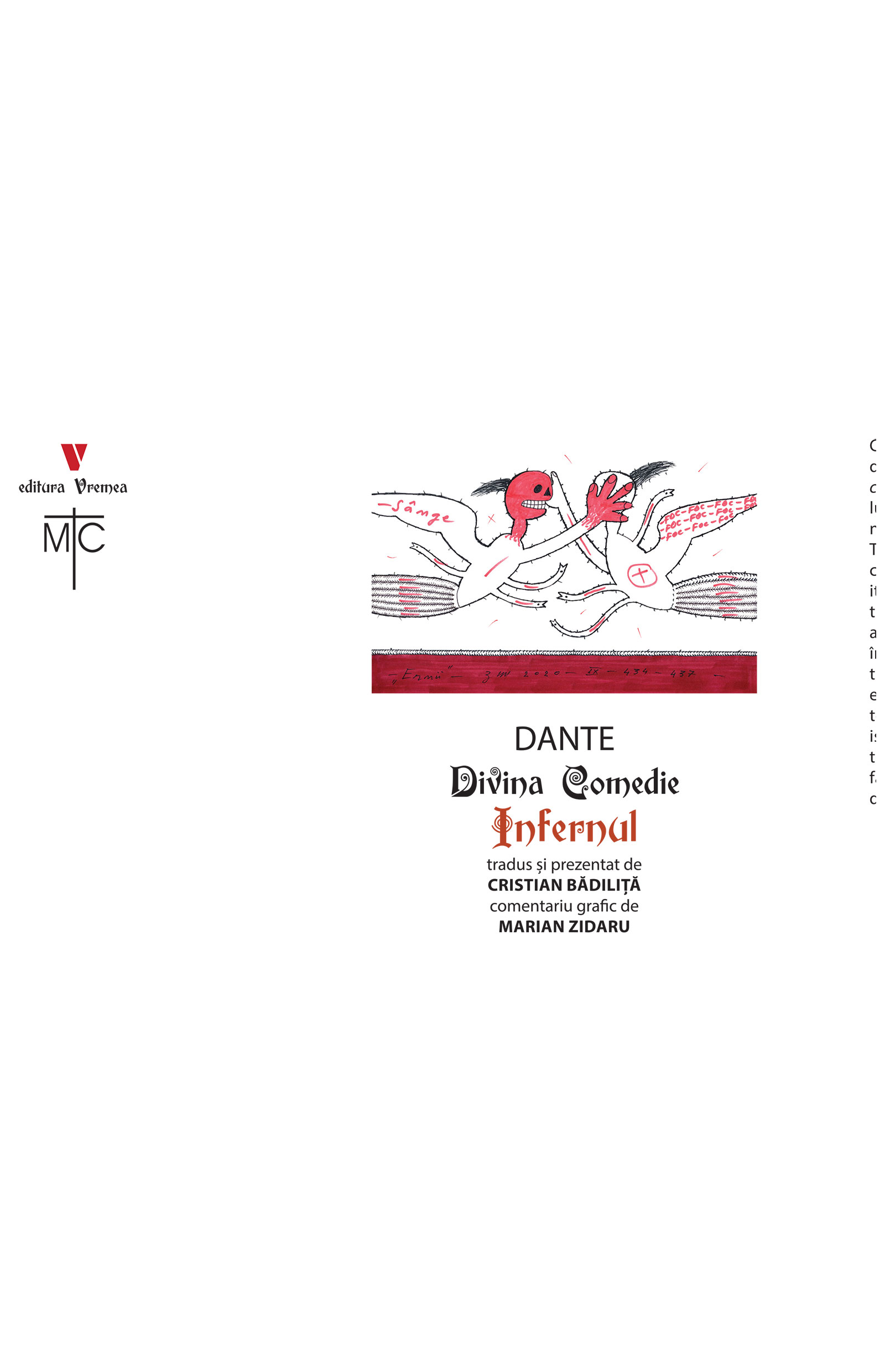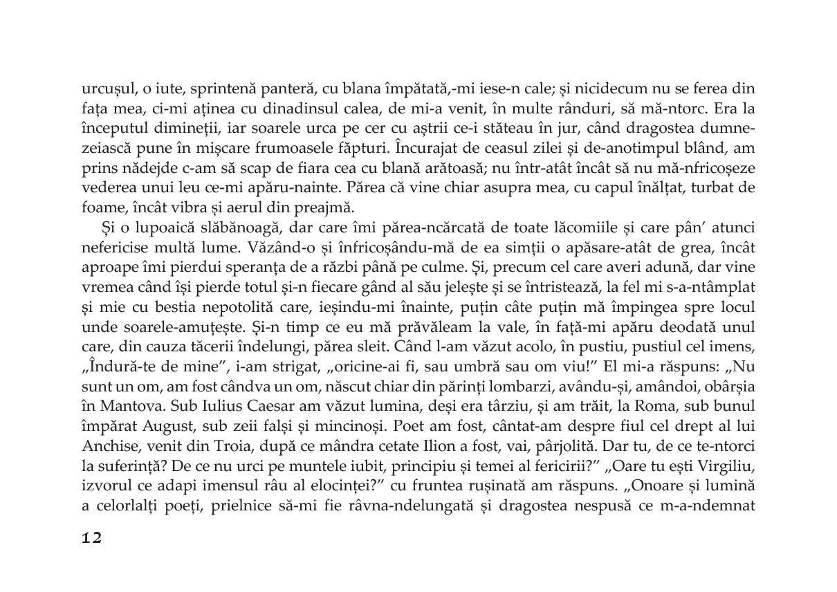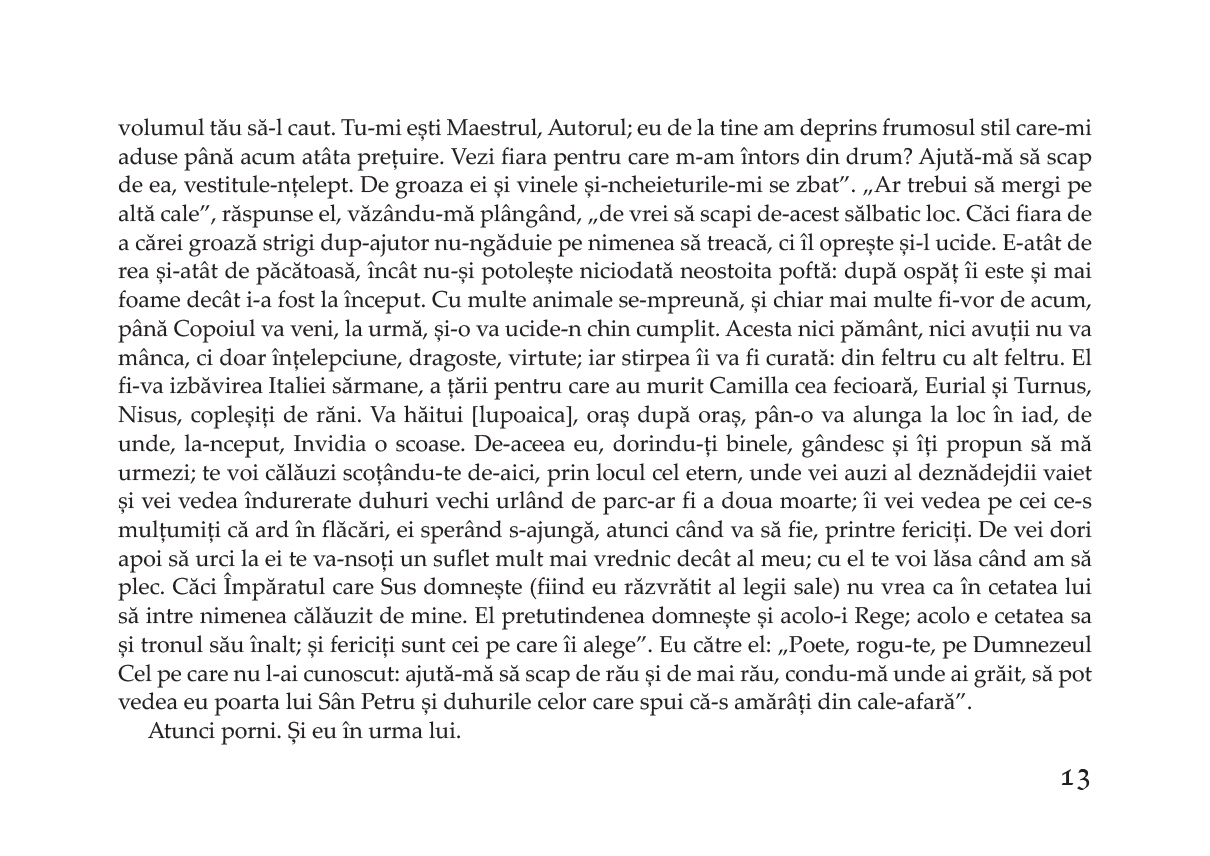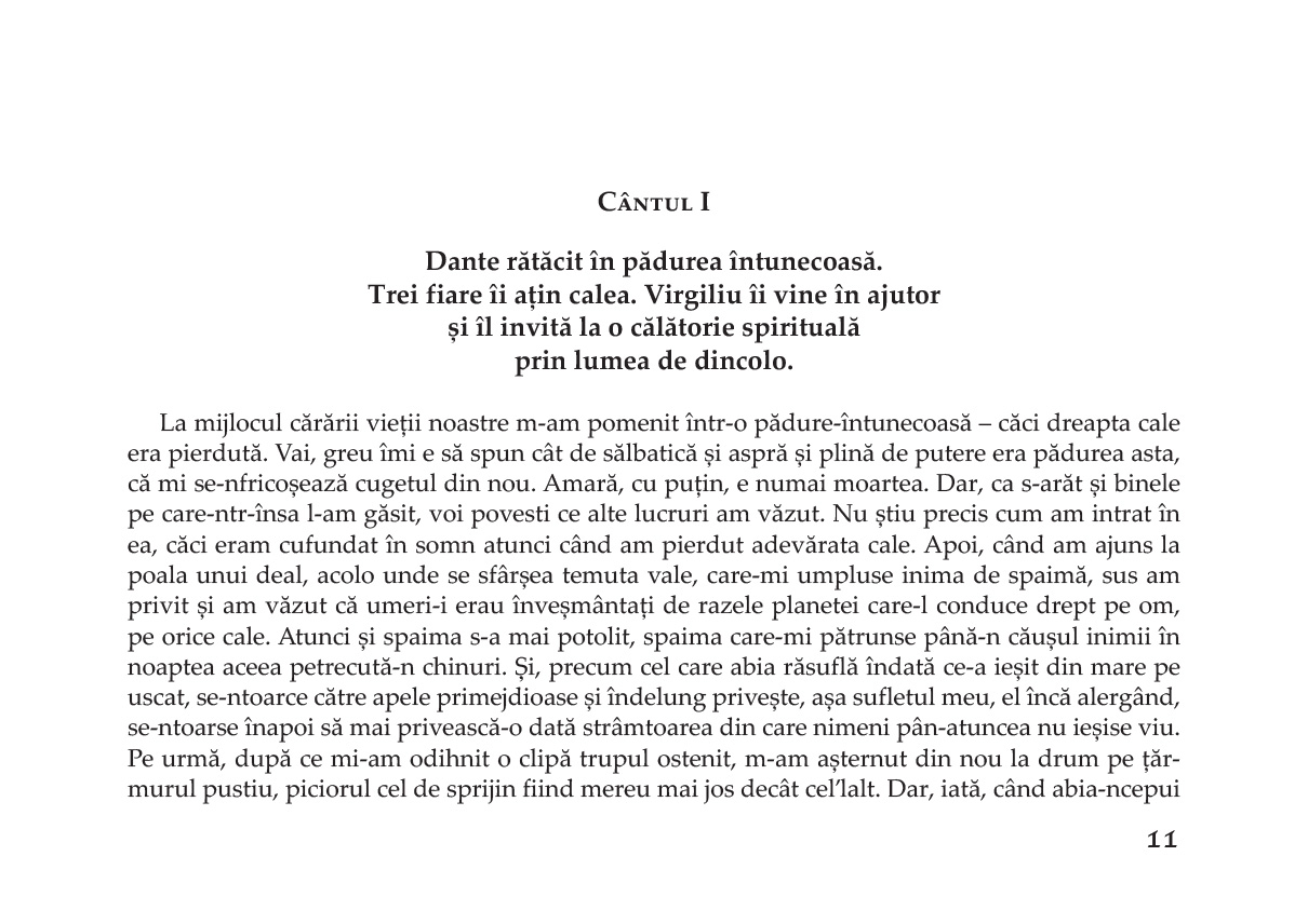"Claritate, ritm, fidelitate au fost criteriile traducerii de față. Am renunțat la rime – așa cum se procedează în multe culturi majore – pentru a reda cât mai limpede și exact conținutul poemei. Mi-am impus un ritm, factor de constrângere, dar element poetic indispensabil. Dante e un poet teolog, un poet mistic, un poet filozof. Conținutul generează forma, nu invers. Traducerea Infernului s-a realizat după clasica ediție a lui Giorgio Petrocchi. Am făcut apel la numeroase Comentarii, atât italiene, cât și neitaliene (engleze, franceze, inclusiv Laszlo Al.), dar Comentariul de bază rămâne al lui Giovanni Fallani și Silvio Zennaro (Roma, 1999)."
