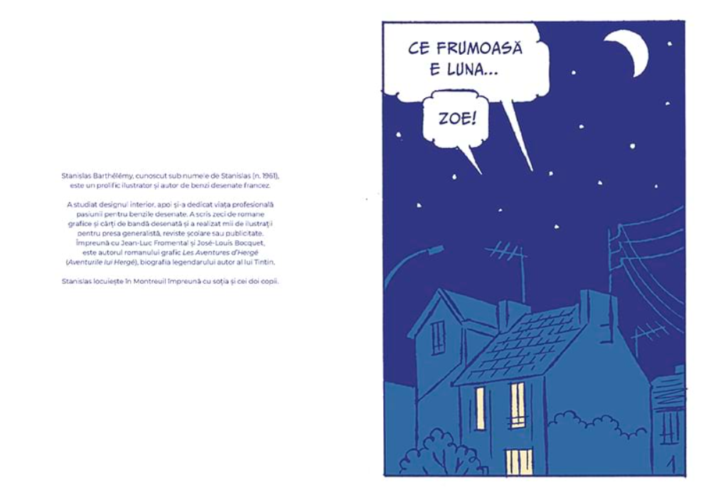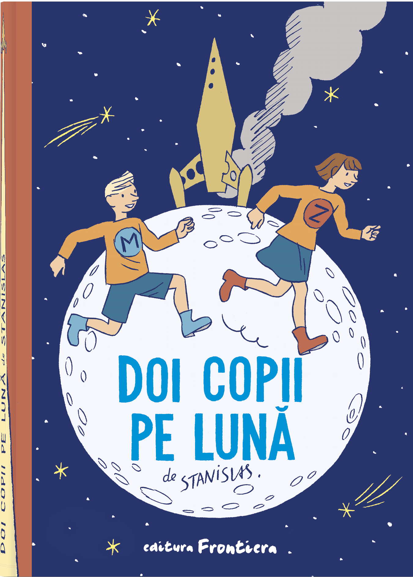 Călătoria în spațiul cosmic ia forma unei benzi desenate încărcate de poezie, umor și mister. Cartea include și macheta ușor de decupat a rachetei cu care au ajuns cei doi copii pe Lună.