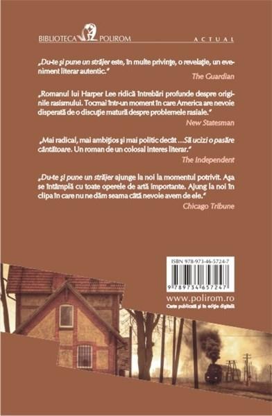 La doua decenii dupa evenimentele din …Sa ucizi o pasare cintatoare, Jean Louise Finch – mai cunoscuta dupa porecla ei, Scout – se intoarce in Maycomb, Alabama, sa-si viziteze tatal, pe Atticus, acum atins de batrinete si de boala. Pe fondul luptei pentru drepturile si libertatile civile care zguduie Sudul Statelor Unite, Jean Louise descopera adevaruri tulburatoare despre familia sa, despre orasul in care a copilarit si despre oamenii care ii sint dragi. Amintirile revin in valuri, iar valorile si opiniile ei sint serios zdruncinate. Du-te si pune un strajer readuce in scena multe dintre personajele romanului …Sa ucizi o pasare cintatoare, surprinzind in chip magistral zbuciumul unei tinere si al unei lumi care trebuie sa depaseasca iluziile trecutului.