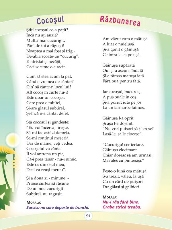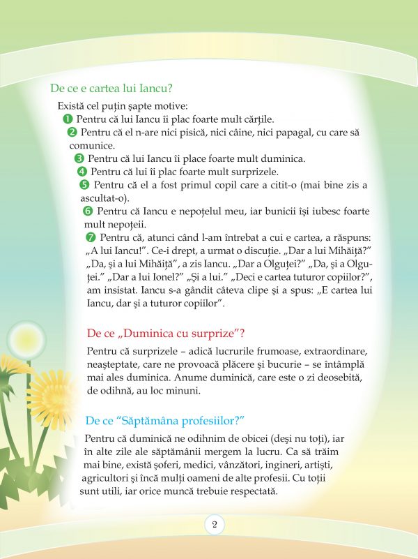 Cartea este structurată în două rubrici: Duminica cu surprize şi Săptămâna profesiilor. Povestioarele şi poeziile incluse în prima parte a cărţii relatează despre întâmplări din viaţa fiinţelor din jurul nostru. Ele sunt moralizatoare, dorind să contribuie la educarea unor valori ca ajutorul, prietenia, compasiunea, dărnicia.