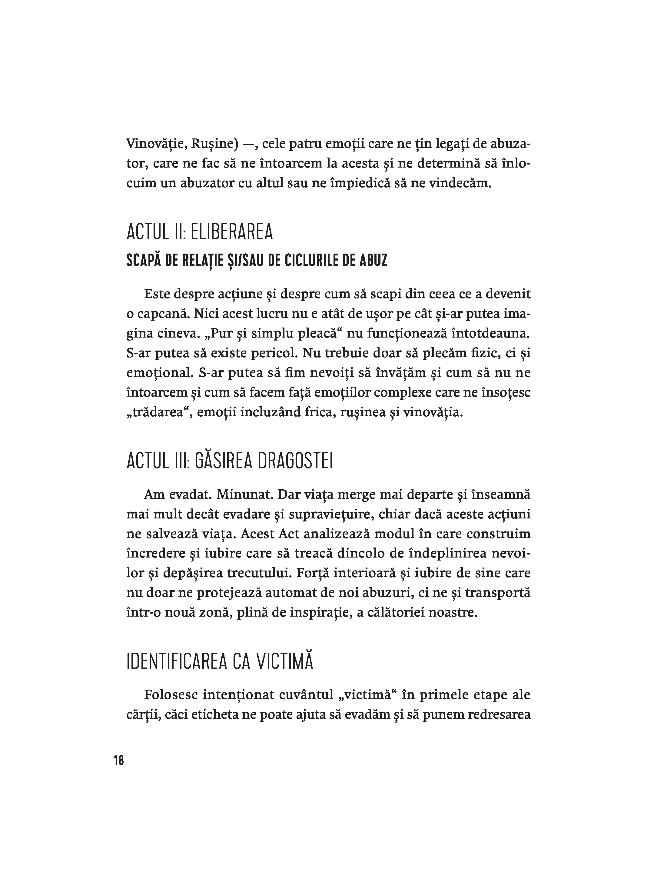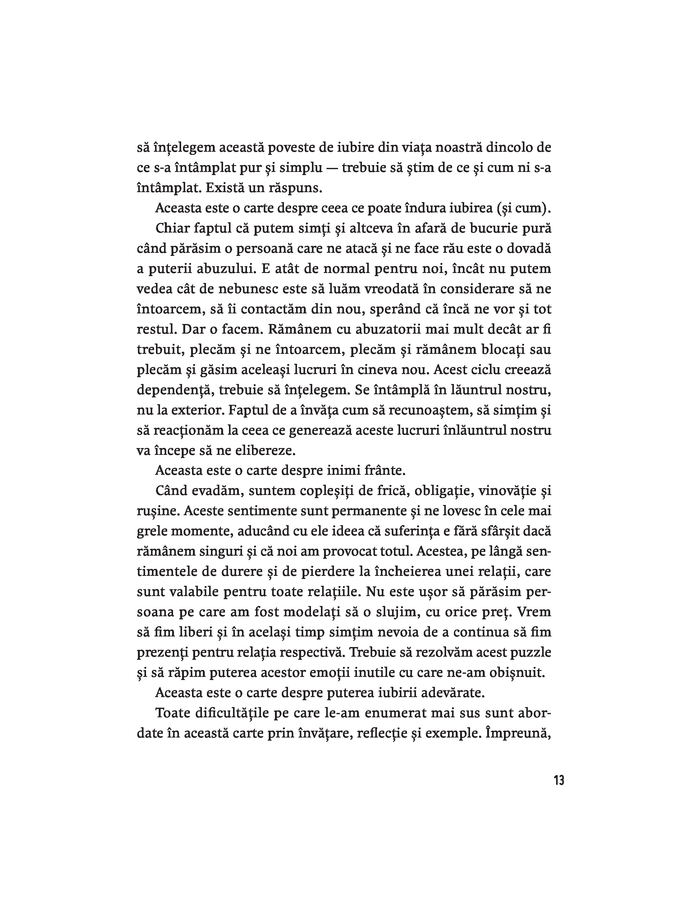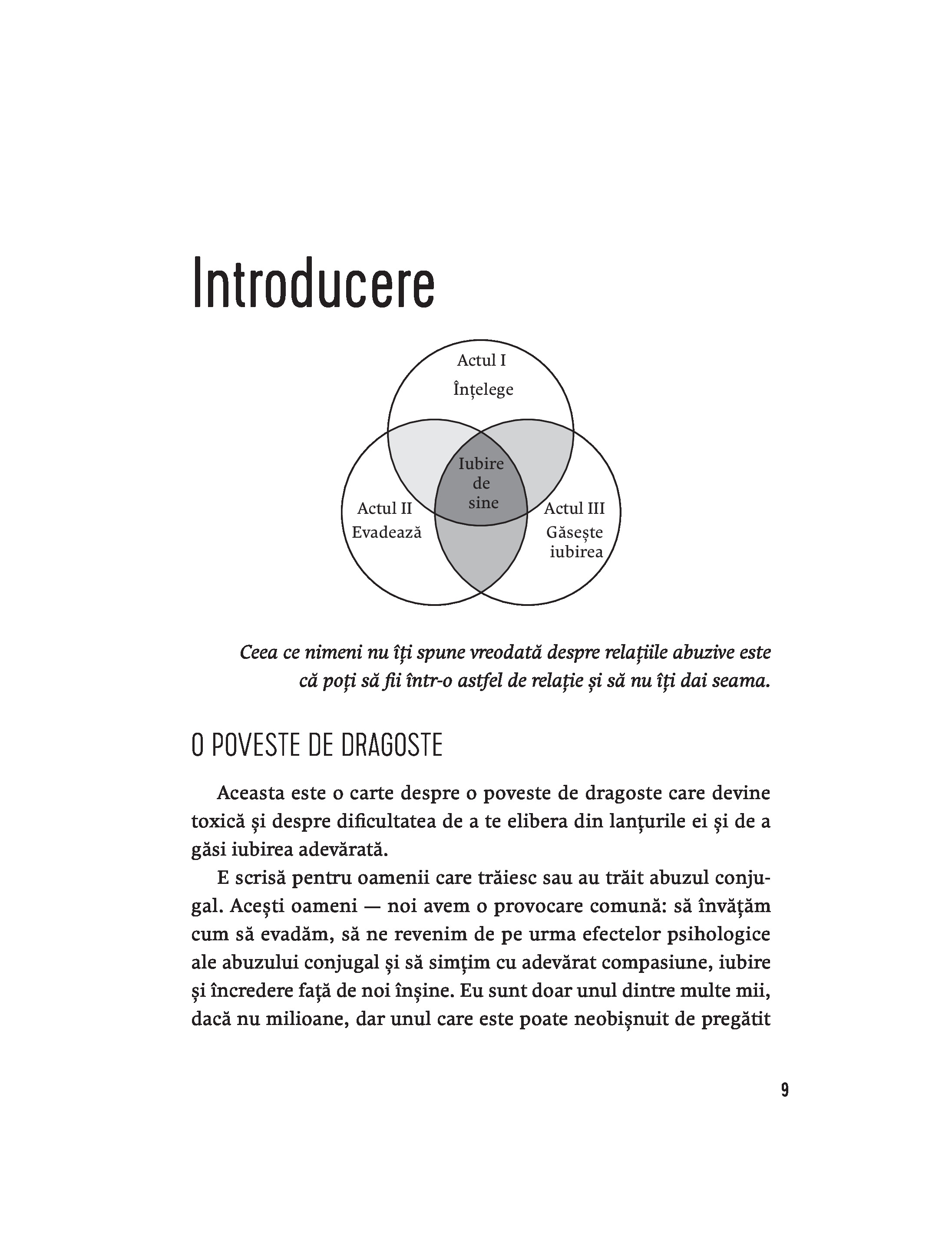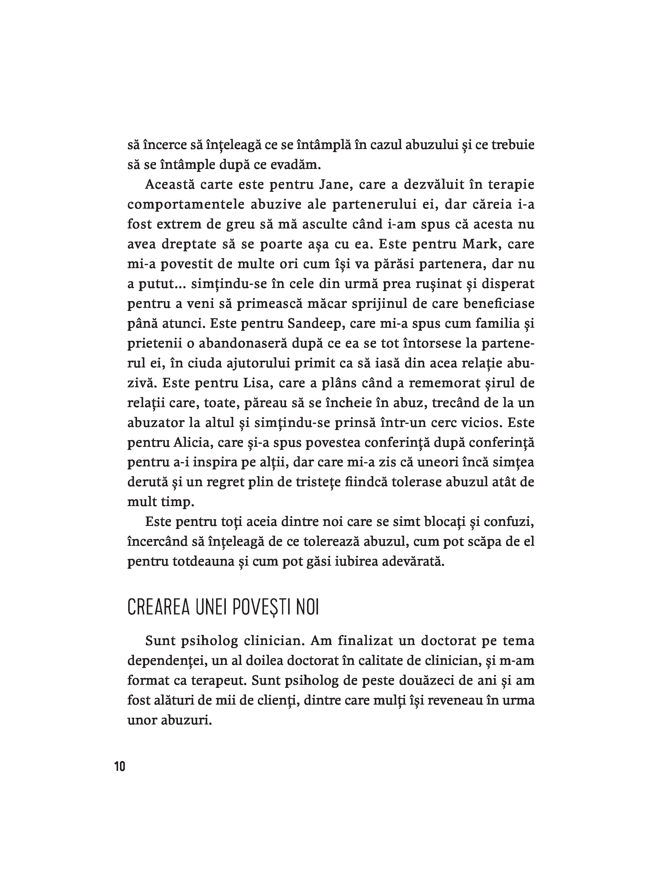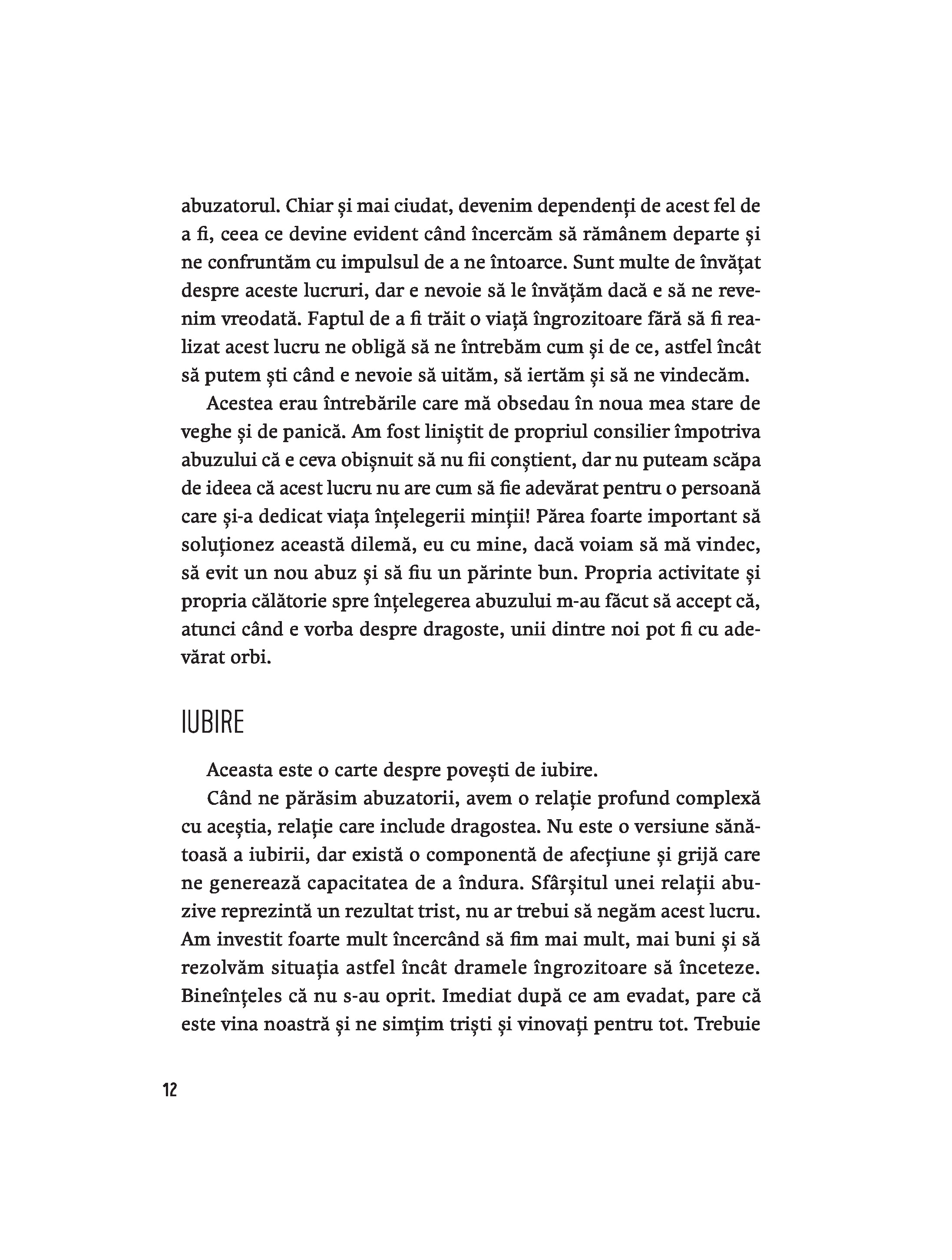 Autorul acestei cărți, care a trecut el însuși printr-o relație toxică, îți propune o călătorie în trei etape, ce te va ajuta în primul rând să înțelegi cum s-a ajuns de la „al nouălea cer“ la iad și să faci pașii necesari pentru a ieși din acea situație și pentru a nu mai intra vreodată într-un ciclu abuziv.