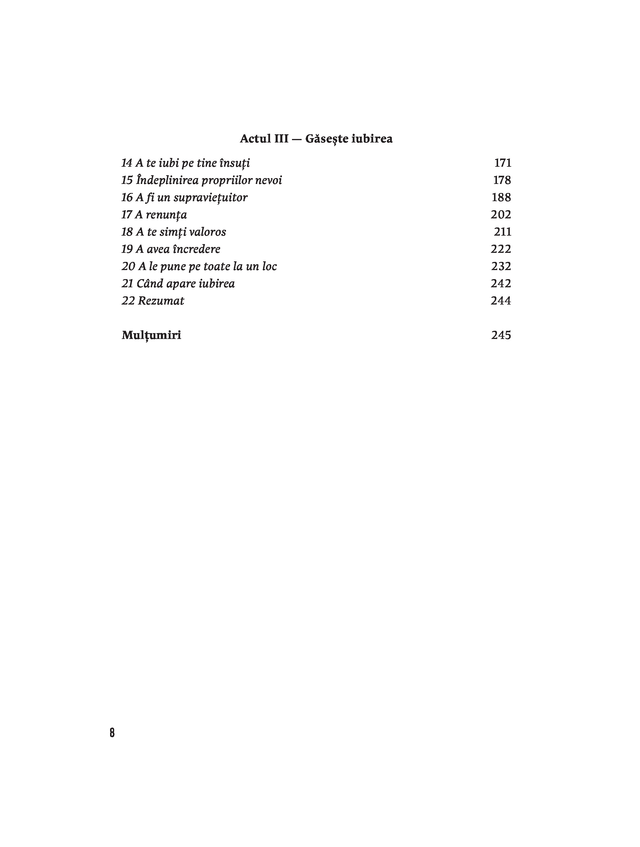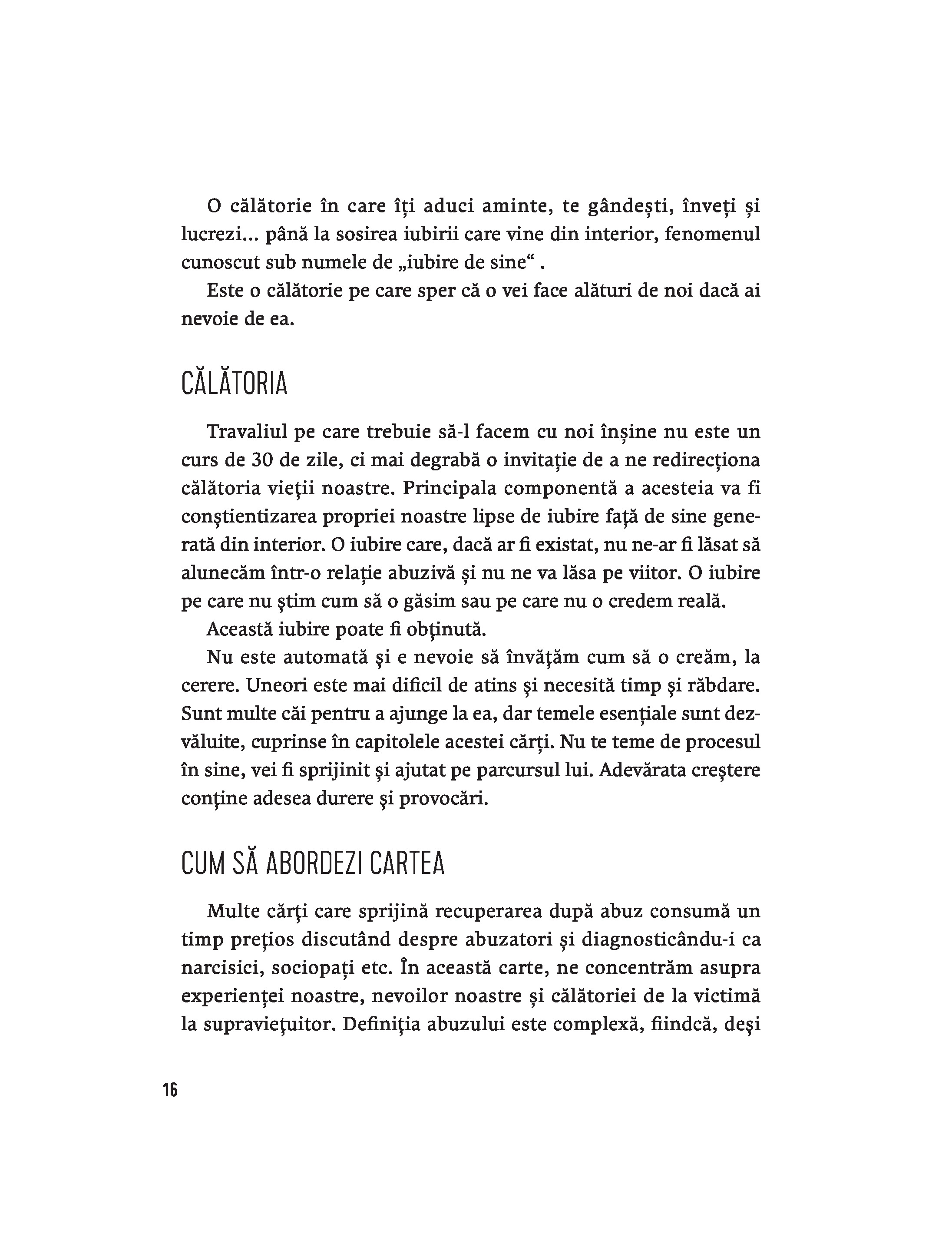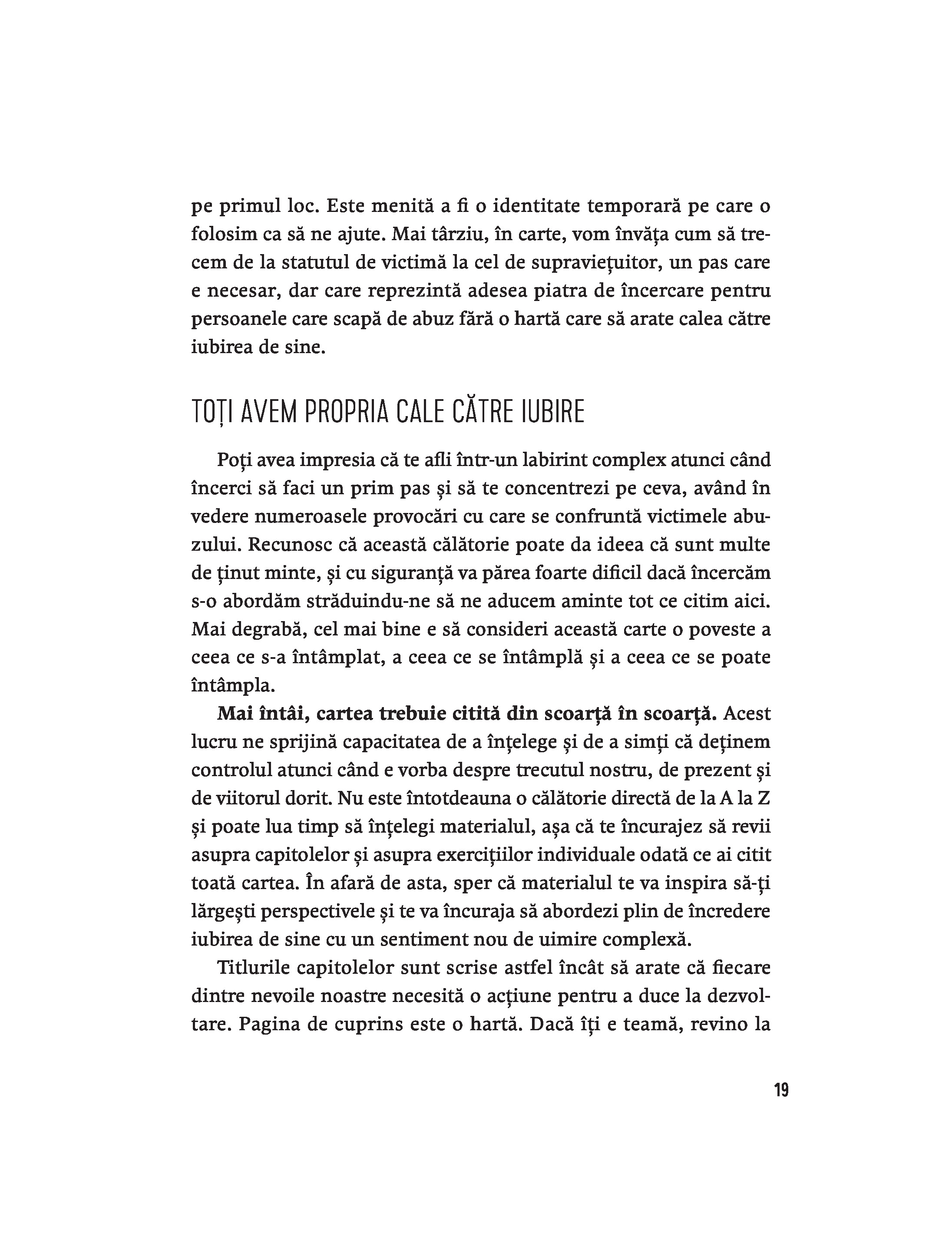 Pe tot parcursul, cu ajutorul exercițiilor și exemplelor din carte, vei învăța să te cunoști pe tine mai bine, să afli care-ți sunt nevoile și să ți le îndeplinești, să-ți oferi compasiune, pentru ca, într-un final, să ajungi la acea iubire de sine sănătoasă, care să te ajute să te dezvolți, să te schimbi, să te bucuri de viață.