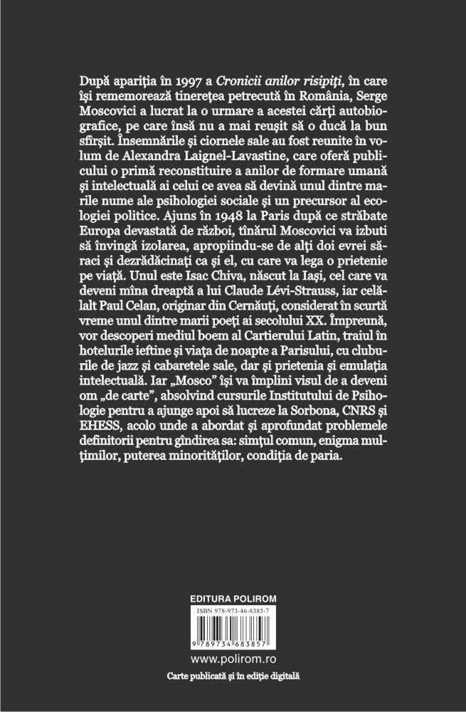 După apariția în 1997 a Cronicii anilor risipiți, în care își rememorează tinerețea petrecută în România, Serge Moscovici a lucrat la o urmare a acestei cărți autobiografice, pe care însă nu a mai reușit să o ducă la bun sfîrșit. Însemnările și ciornele sale au fost reunite în volum de Alexandra Laignel-Lavastine, care oferă publicului o primă reconstituire a anilor de formare umană și intelectuală ai celui ce avea să devină unul dintre marile nume ale psihologiei sociale și un precursor al ecologiei politice. Ajuns în 1948 la Paris după ce străbate Europa devastată de război, tînărul Moscovici va izbuti să învingă izolarea, apropiindu-se de alți doi evrei săraci și dezrădăcinați ca și el, cu care va lega o prietenie pe viață. Unul este Isac Chiva, născut la Iași, cel care va deveni mîna dreaptă a lui Claude Lévi-Strauss, iar celălalt Paul Celan, originar din Cernăuți, considerat în scurtă vreme unul dintre marii poeți ai secolului XX. Împreună, vor descoperi mediul boem al Cartierului Latin, traiul în hotelurile ieftine și viața de noapte a Parisului, cu cluburile de jazz și cabaretele sale, dar și prietenia și emulația intelectuală. Iar „Mosco” își va împlini visul de a deveni om „de carte”, absolvind cursurile Institutului de Psihologie pentru a ajunge apoi să lucreze la Sorbona, CNRS și EHESS, acolo unde a abordat și aprofundat problemele definitorii pentru gîndirea sa: simțul comun, enigma mulțimilor, puterea minorităților, condiția de paria.