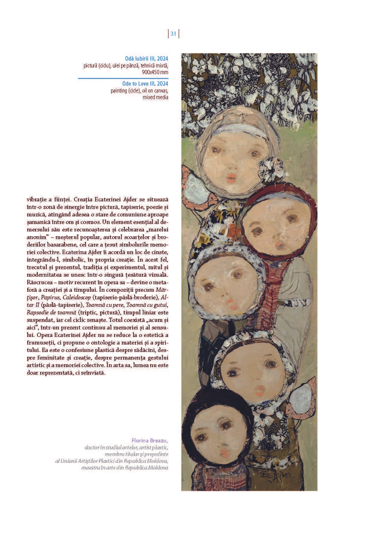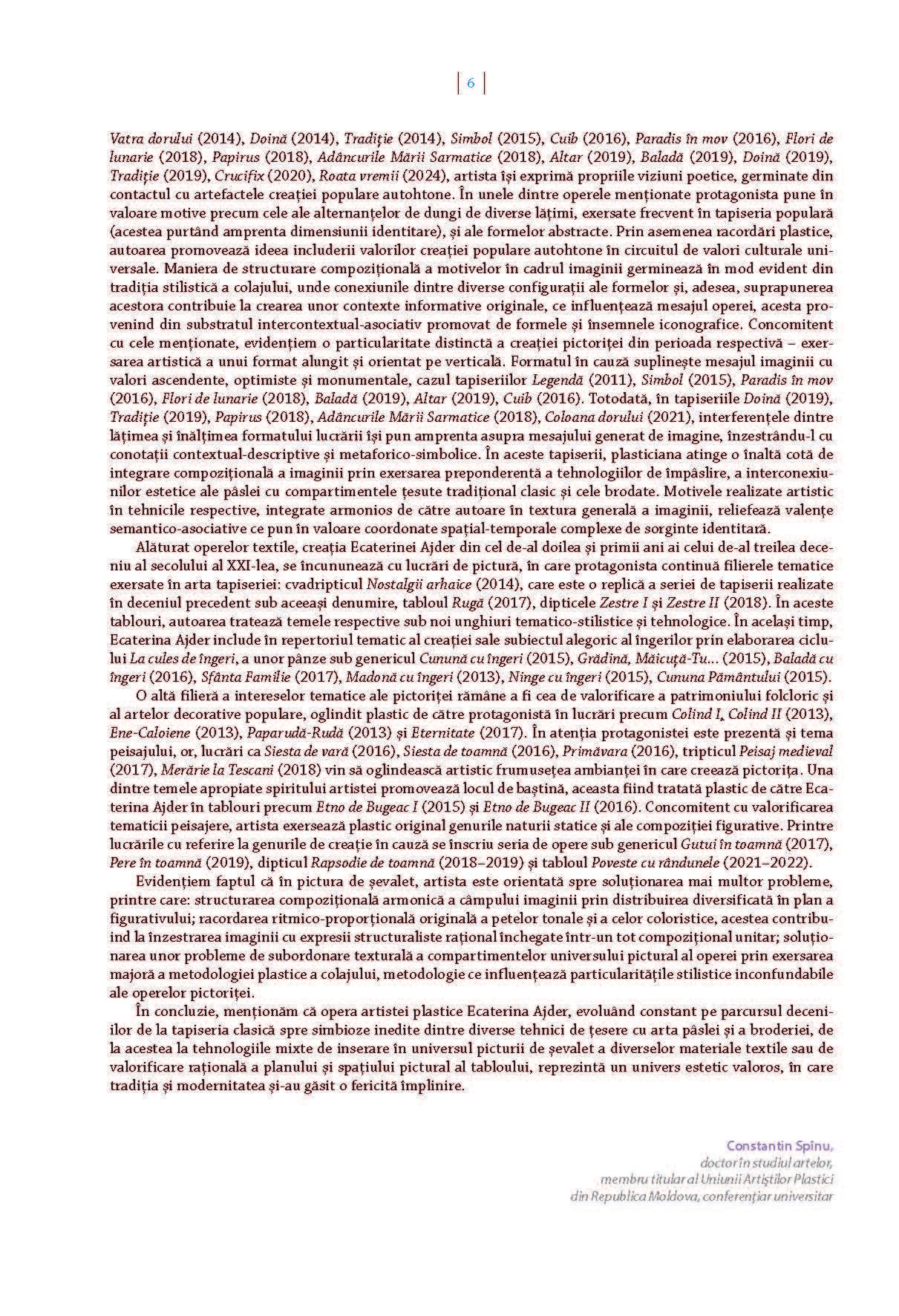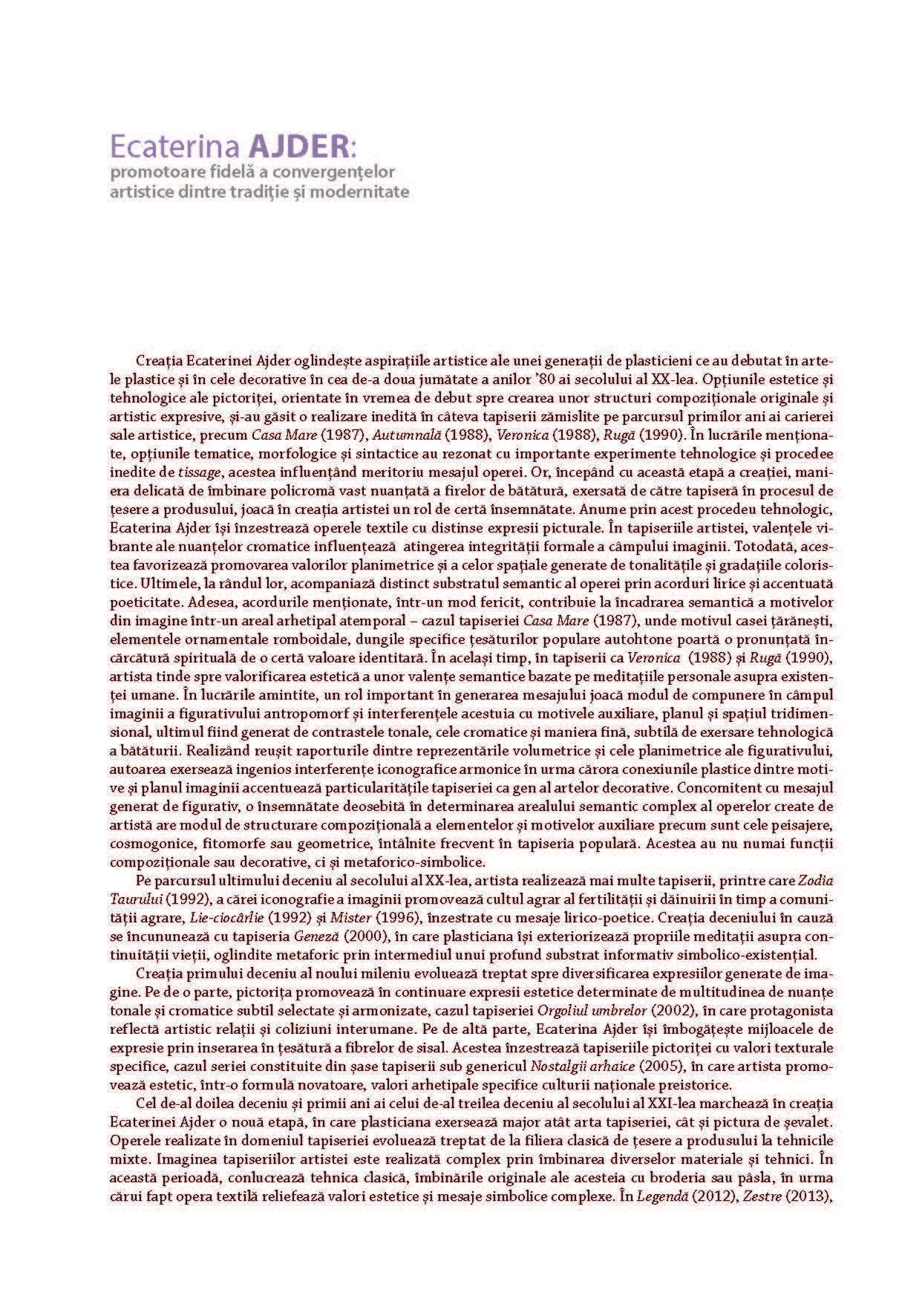 Albumul prezintă o selecție de lucrări de Artă Textilă și Pictură, realizate de autoarea Ecaterina Ajder pe parcursul unei perioade de 35 de ani. Aceste creații au fost expuse la numeroase evenimente prestigioase, incluzând expoziții, bienale, trienale și concursuri naționale și internaționale.