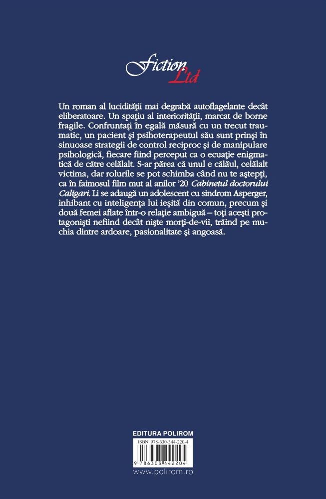 Confruntați în egală măsură cu un trecut traumatic, un pacient și psihoterapeutul său sunt prinși în sinuoase strategii de control reciproc și de manipulare psihologică, fiecare fiind perceput ca o ecuație enigmatică de către celălalt. S-ar părea că unul e călăul, celălalt victima, dar rolurile se pot schimba când nu te aștepți, ca în faimosul film mut al anilor ’20 Cabinetul doctorului Caligari. Li se adaugă un adolescent cu sindrom Asperger, inhibant cu inteligența lui ieșită din comun, precum și două femei aflate într-o relație ambiguă – toți acești protagoniști nefiind decât niște morți-de-vii, trăind pe muchia dintre ardoare, pasionalitate și angoasă.