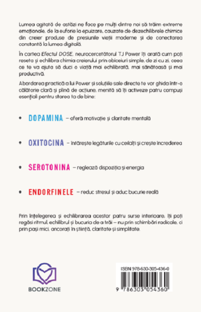În cartea Efectul DOSE, neurocercetătorul TJ Power îți arată cum poți reseta și echilibra chimia creierului prin obiceiuri simple, de zi cu zi, ceea ce te va ajuta să duci o viață mai echilibrată, mai sănătoasă și mai productivă.